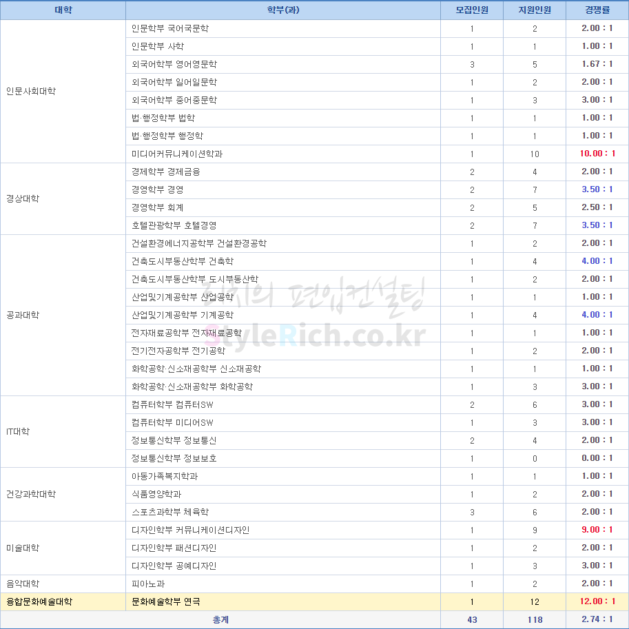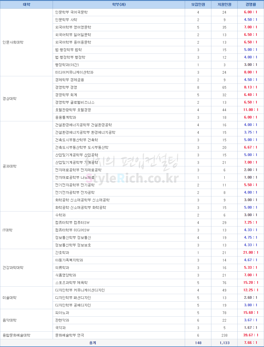 간호학과가 경쟁률이 가장 높고 전자재료공학부 나노재료과가 가장 낮으며 정원 충족입니다.(예체능 제외)