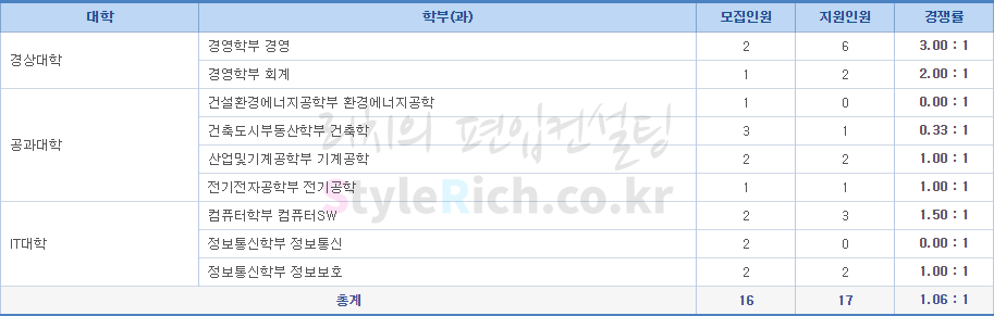 경영과가 경쟁률이 가장 높고, 환경에너지공학, 정보통신과가 가장 낮으며 정원 미달입니다.