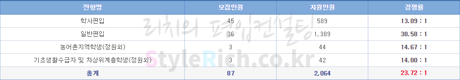 일반편입 경쟁률이 가장 높으며, 학사편입이 가장 낮습니다.