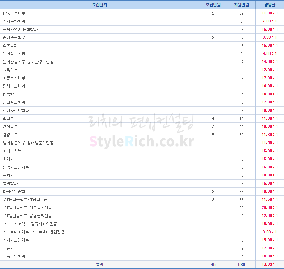 2019학년도 숙명여대 편입 전형별 경쟁률 현황