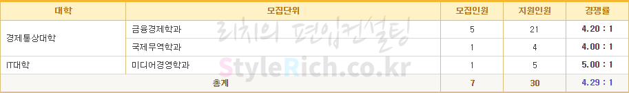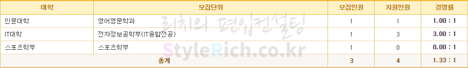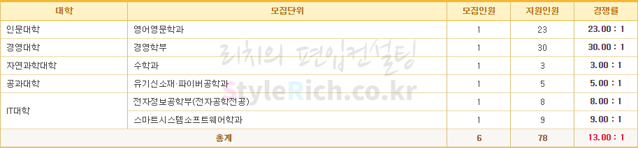 전자정보공학부(IT융합전공)이 경쟁률이 가장 높고 스포츠학부가 가장 낮고 정원 미달입니다.