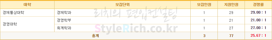 경제학과가 경쟁률이 가장 높고 경영학부가 가장 낮습니다.
