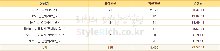 일반편입학의 경쟁률이 가장 높으며, 재외국민 편입학이 가장 낮습니다.