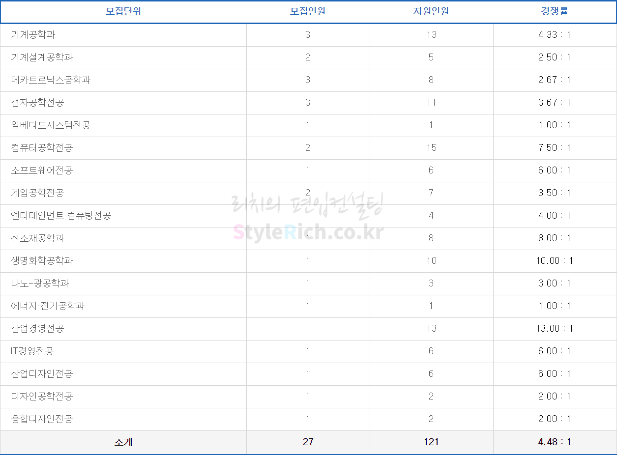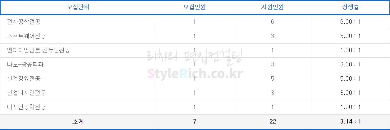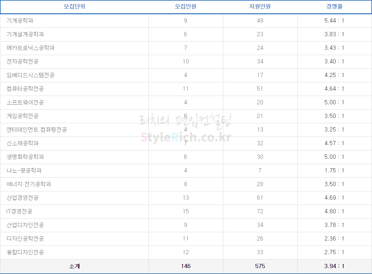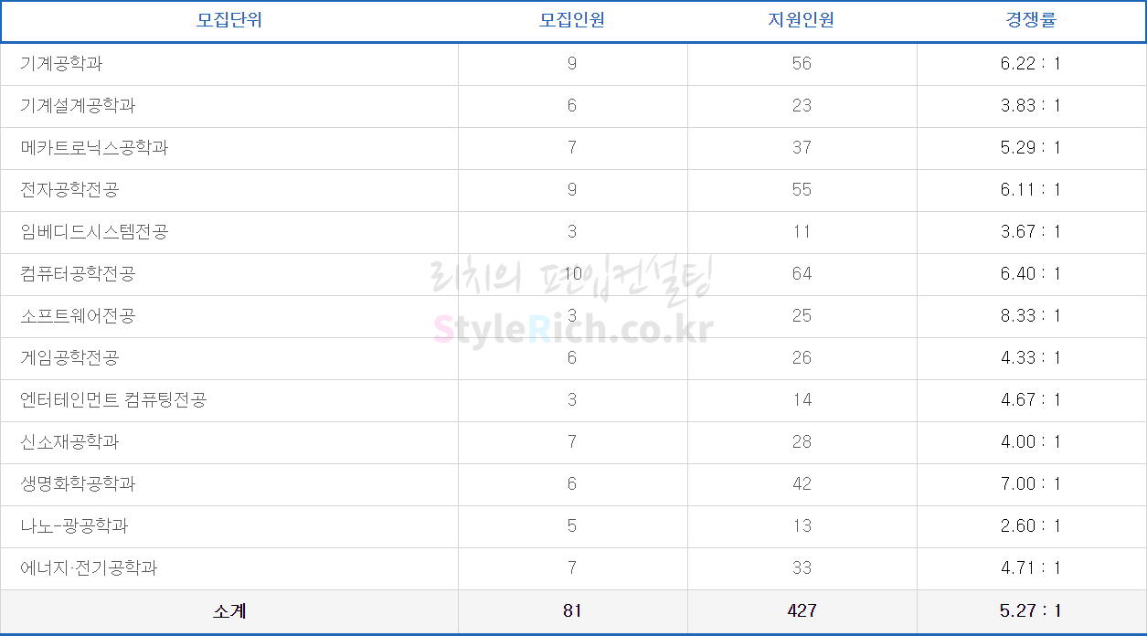 전자공학전공의 경쟁률이 가장 높고 엔터테인먼트 컴퓨팅전공, 디자인공학전공이 가장 낮고 정원 충족입니다.