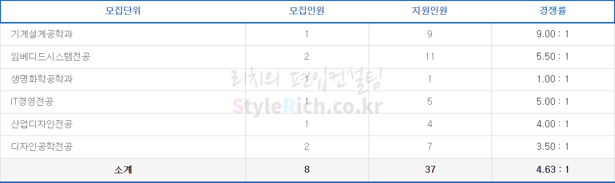 산업경영전공의 경쟁률이 가장 높고 임베디드시스템전공, 에너지·전기공학과가 가장 낮고 정원 충족입니다.