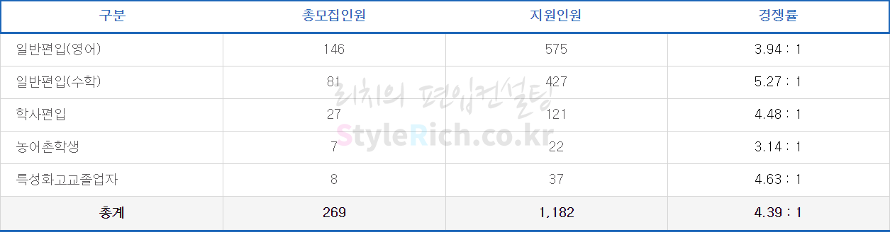 일반편입(수학)의 경쟁률이 가장 높고 농어촌학생이 가장 낮습니다.