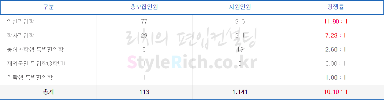 일반편입학의 경쟁률이 가장 높고 재외국민 편입학(3학년)이 가장 낮고 정원미달입니다.