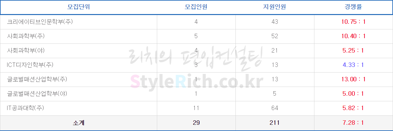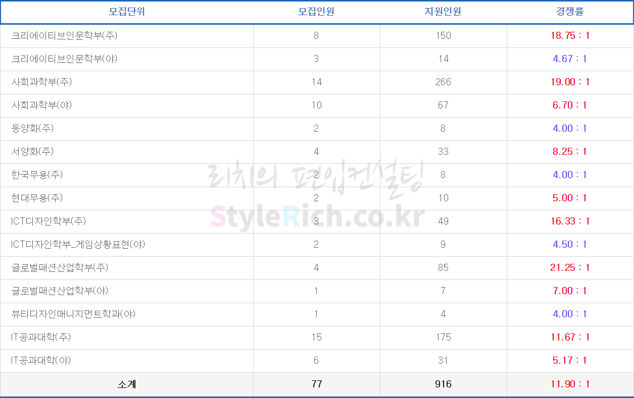 글로벌패션산업학부(주)의 경쟁률이 가장 높고 글로벌패션산업학부(야)가 가장 낮습니다. (ICT디자인학부 제외)