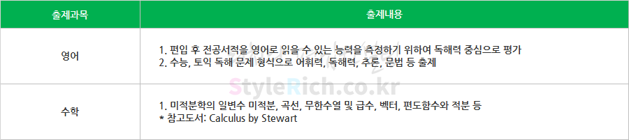 편입영어는 독해문제 형식의 어휘력, 독해력, 추론 등을 출제하며, 편입수학은 미적분, 곡선, 무한수열 및 급수, 벡터, 편도함수와 적분 등을 출제합니다.