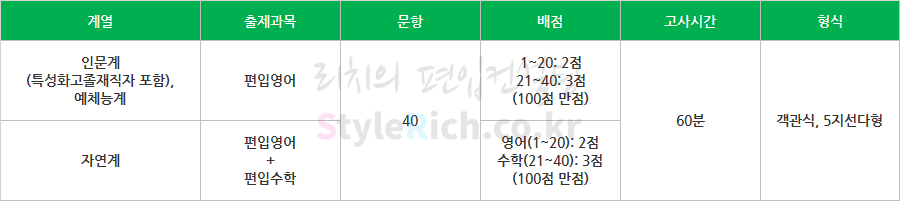 필기고사는 응시계열에 따라 필기고사의 출제과목이 달라지게 됩니다. 인문계(특성화고졸재직자 포함), 예체능계는 편입영어를 실시하고, 자연계는 편입영어와 편입수학을 실시합니다. 계열에 따른 문항, 배점, 고사시간, 형식에 대한 자세한 사항은 아래 표를 참고하세요.