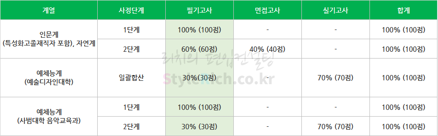 예체능계의 경우 실질적으로 70%를 차지하는 실기고사가 당락을 좌우할 가능성이 높습니다. 다만, 예체능계(사범대학 음악교육과)의 경우는 예체능계(예술디자인대학)에서 실시하는 일괄전형과는 달리 1단계에서 필기고사를 100% 반영하기 때문에 중요도가 상대적으로 높다고 할 수 있습니다.