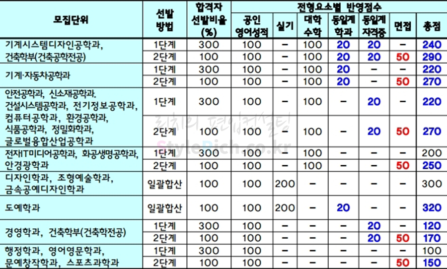 동일계 학과와 동일계 자격증에 가산점과 면접이 있느냐 없느냐에 따라 총점은 달라지지만 가산점과 면접을 제외하면 대학수학시험과 공인영어성적이 각각 50%를 차지할 정도로 중요하다고 볼 수 있습니다. 하지만 동일계 학과, 동일계 자격증 가산점과 면접을 합치면 최대 90점을 반영하기 때문에 가산점과 면접을 무시할 수 없습니다. 그러므로 전형요소를 잘 파악하여 가산점과 면접이 있는 모집단위는 동일계 학과로 지원하는 전략을 세우는 것이 유리합니다.
