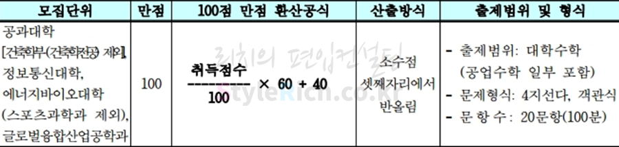 2019학년도 서울과학기술대 편입 대학수학시험의 점수환산은 40점이 기본점수로 들어가기 때문에 실질적으로 60점이 반영됩니다. 단, 시험에 응시하지 않으면 0점입니다.