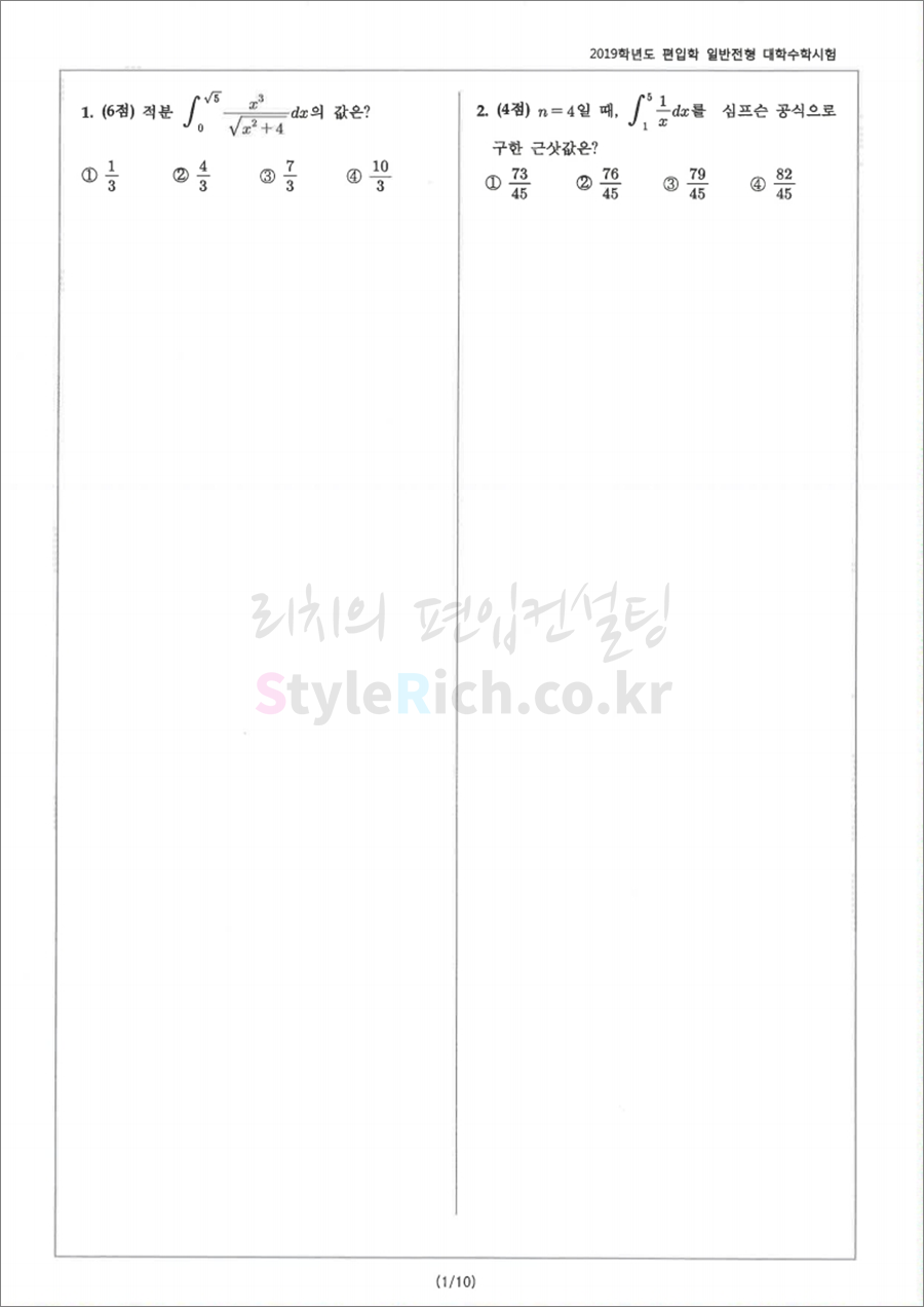 2019학년도 서울과학기술대 편입 대학수학시험은 총 20문항 100분, 객관식 4지선다형, 배점은 10문항 4점, 10문항 6점으로 100점 만점입니다. 하지만 오답은 해당 점수의 1/4를 감점하므로 신중하게 작성해야 합니다.