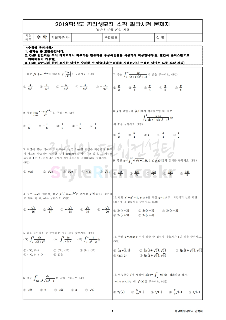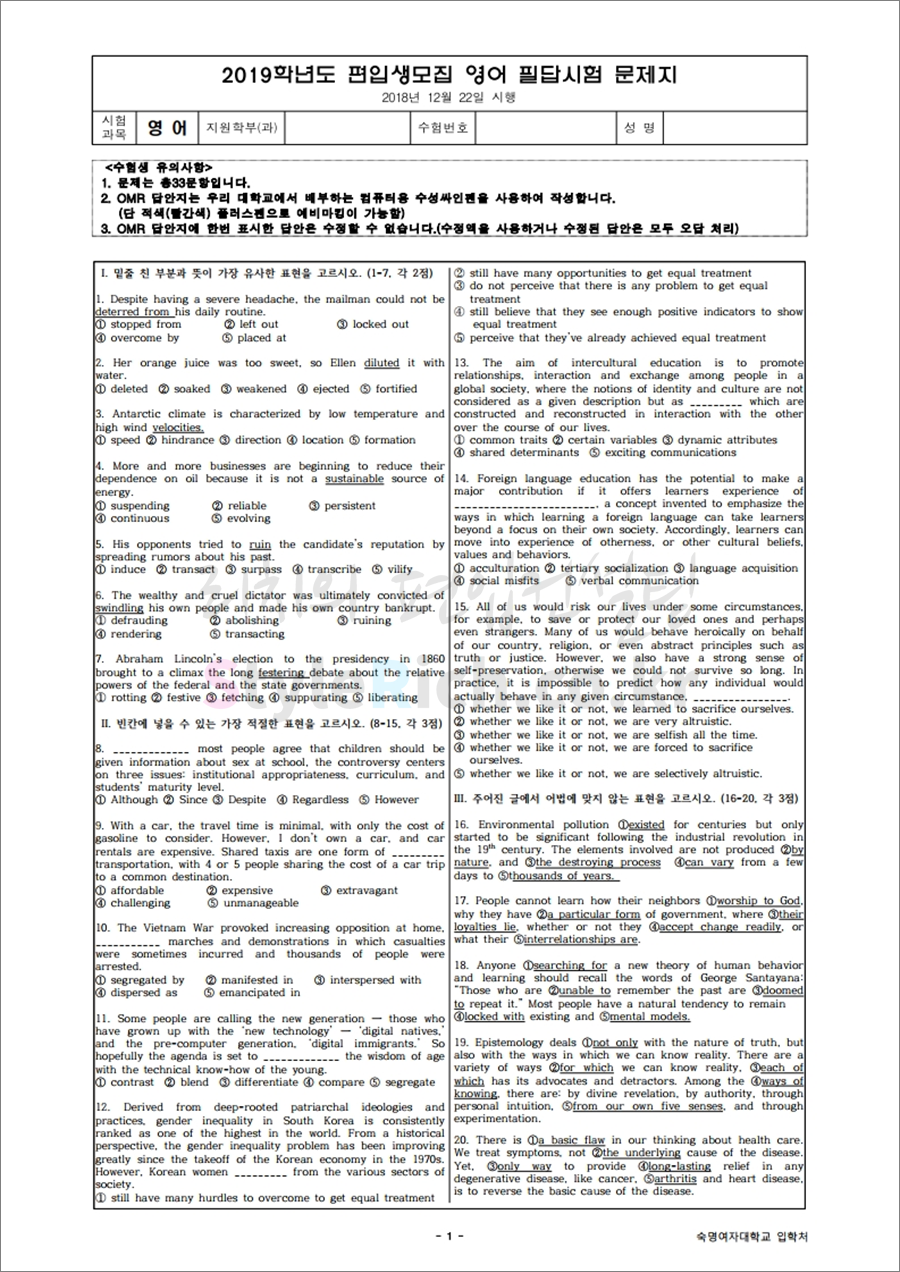 2019학년도 숙명여대 편입 기출문제 다운받기