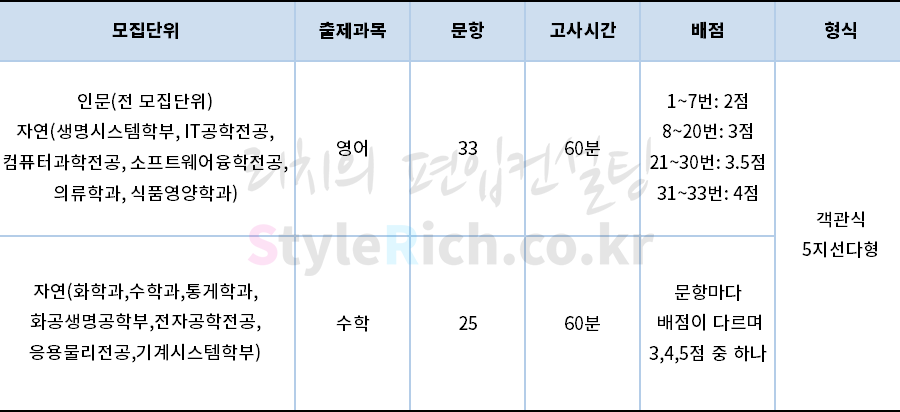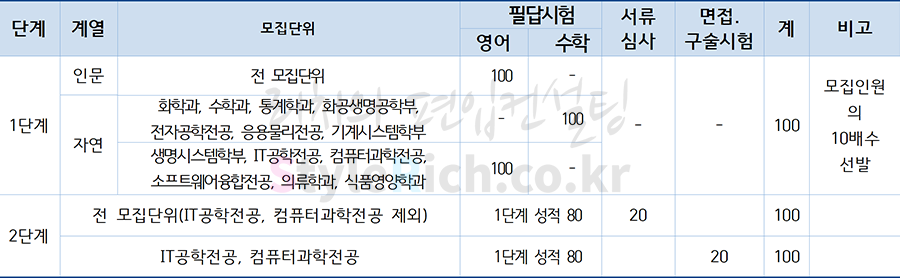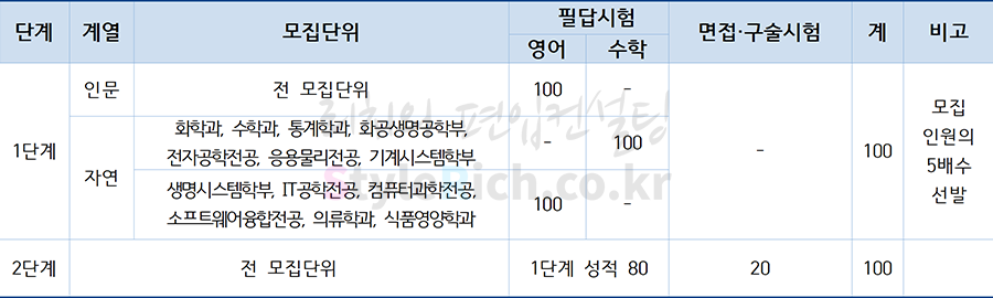 자연(화학과, 수학과, 통계학과, 화공생명공학부, 전자공학전공, 응용물리전공, 기계시스템학부)의 1단계 전형에서도 편입수학을 100%를 반영하고 있고 2단계에서도 80%를 반영하고 있어 편입수학도 해당 학과의 당락에 중요한 요소를 차지합니다.