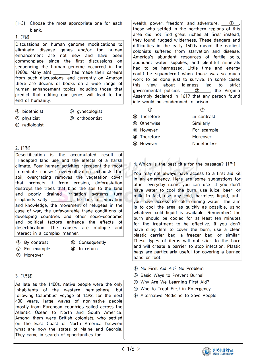 2019학년도 인하대 편입 필기고사 기출문제 다운받기