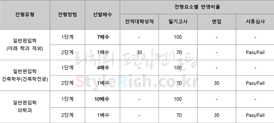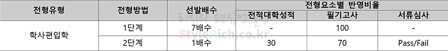 2019학년도 인하대 학사편입학 전형요소별 반영비율은 1단계 필기고사 100%, 2단계 70%입니다.