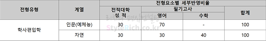 2019학년도 인하대 학사편입학 전형요소별 세부반영비율을 살펴보면 인문(예체능)은 영어 70%, 자연은 영어 30%, 수학 40%입니다.