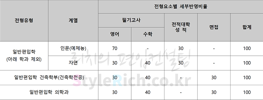 2019학년도 인하대 일반편입학 전형요소별 세부반영비율을 살펴보면 인문(예체능)은 영어 70%, 자연은 영어 30%, 수학 40%입니다.
