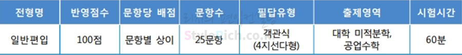 2019학년도 일반편입(수학)에서 실시하는 수학고사는 25문항 60분, 객관식 4지선다형, 총점 100점 만점에 배점은 3, 4, 5점으로 문항마다 다릅니다. 영어 기출문제와는 달리 수학 기출문제에는 문항당 배점이 표시되어 있습니다. 출제영역은 대학 미적분학, 공업수학입니다.