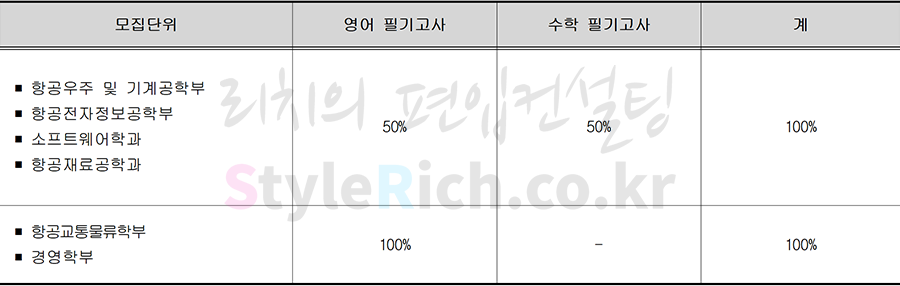2019학년도 한국항공대 일반편입학, 학사편입학, 농·어촌학생 편입학, 특성화고교졸업자 편입학, 기회균형선발 편입학에서 항공우주 및 기계공학부, 항공전자정보공학부, 소프트웨어학과, 항공재료공학과는 영어 50%, 수학 50%를 반영하고 항공교통물류학부, 경영학부는 영어 100%를 반영합니다.