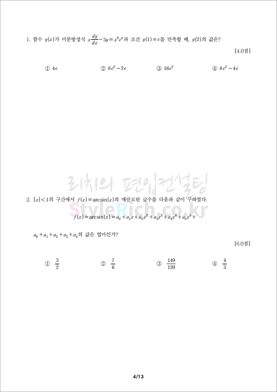 2019학년도 한국항공대 편입 영어 필기고사는 40문항 60분, 객관식 4지선다형, 총 100점 만점에 배점은 각 문항마다 다릅니다. 출제 범위는 TOEFL형식의 객관식 문제로 구성되고, 듣기평가는 포함되지 않습니다. 수학 필기고사는 20문항 60분, 객관식 4지선다형, 총 100점 만점에 배점은 4, 5, 6점으로 문항마다 다릅니다. 출제범위는 대학 1학년, 2학년 과정 대학수학과 공학수학입니다.