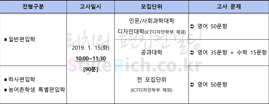 2019학년도 한성대 일반편입학의 인문/사회과학대학/디자인대학(ICT디자인 제외)와 학사, 농어촌학생 특별편입학의 전 모집단위(ICT디자인학부 제외)는 영어고사로 50문항 90분, 객관식 4지선다형, 총점 100점 만점에 배점은 1.5, 2, 2.5점으로 문항마다 다릅니다. 일반편입학의 공과대학은 영어+수학고사로 50문항(영어 35문항, 수학 15문항) 90분, 객관식 4지선다형, 총점 100점 만점(영어 70점, 수학 30점)에 배점은 1.5, 2, 2.5점으로 문항마다 다릅니다.
