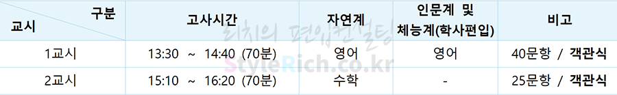 2019학년도 한양대(에리카) 편입 고사과목은 인문계 및 체능계는 영어, 자연계는 영어, 수학입니다. 영어는 40문항 70분, 객관식 4지선다형, 총점 100점 만점에 배점은 2점 20문항, 3점 20문항으로 구성되어 있습니다. 수학은 25문항 70분, 객관식 4지선다형, 총점 100점 만점에 배점은 문항마다 3, 4, 5점으로 다릅니다.