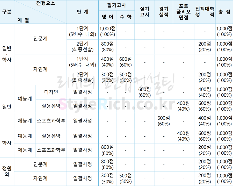 2019학년도 한양대(에리카) 일반, 학사편입의 인문계는 다단계 전형으로 1단계 영어 100%, 2단계 영어 80%, 전적대학 성적 20%이고 자연계도 다단계 전형으로 1단계 영어 30%, 수학 50%, 2단계 영어 30%, 수학 50%, 전적대학 성적 20%입니다. 학사 체능계의 스포츠과학부는 일괄전형으로 영어 80%, 전적대학 성적 20%입니다. 정원외 인문계는 일괄전형으로 영어 80%, 전적대학 성적 20%입니다. 정원외 자연계는 일괄전형으로 영어 30%, 수학 50%, 전적대학 성적 20%입니다.