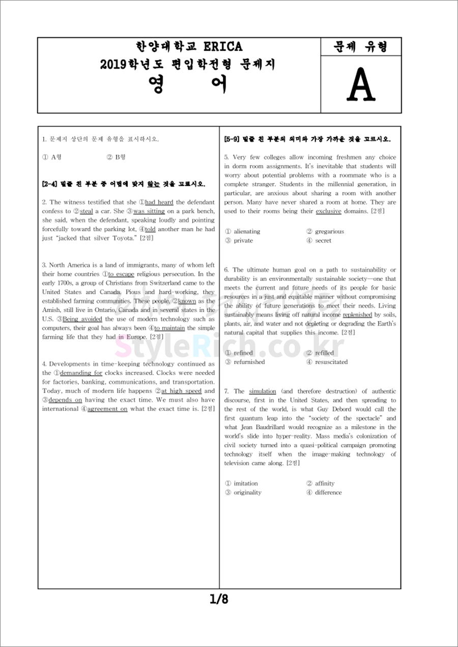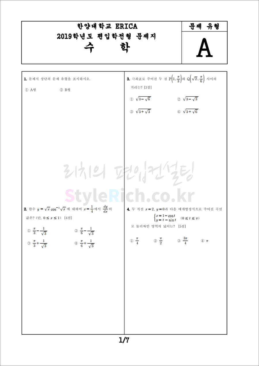 한양대(에리카) 편입 2019학년도 기출문제를 알아보자