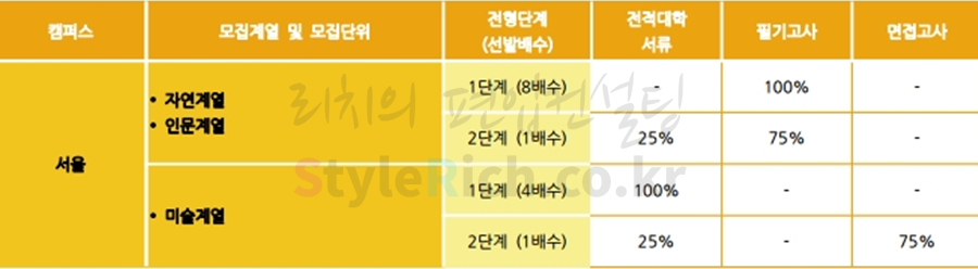 2019학년도 홍익대 서울캠퍼스 편입은 인문계열, 자연계열, 미술계열 모두 다단계 전형입니다. 인문계열은 1단계 영어 100%, 2단계 영어 75%, 전적대 성적 25%, 자연계열은 1단계 영어+수학 100%, 2단계 전적대 성적 25%, 미술계열은 1단계 전적대 서류 100%, 2단계 면접고사 75%, 전적대 서류 25%입니다. 세종캠퍼스 편입은 인문/자연은 공인영어 성적과 전적대 성적, 미술은 면접고사와 전적대 서류, 체육은 경기실적으로 선발합니다.