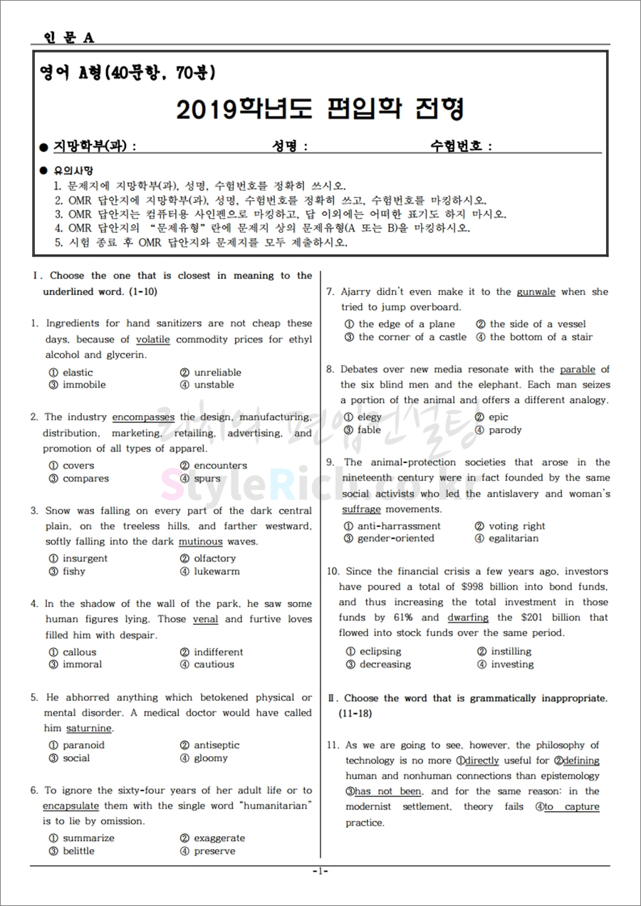 한양대(에리카) 편입 2019학년도 기출문제를 알아보자