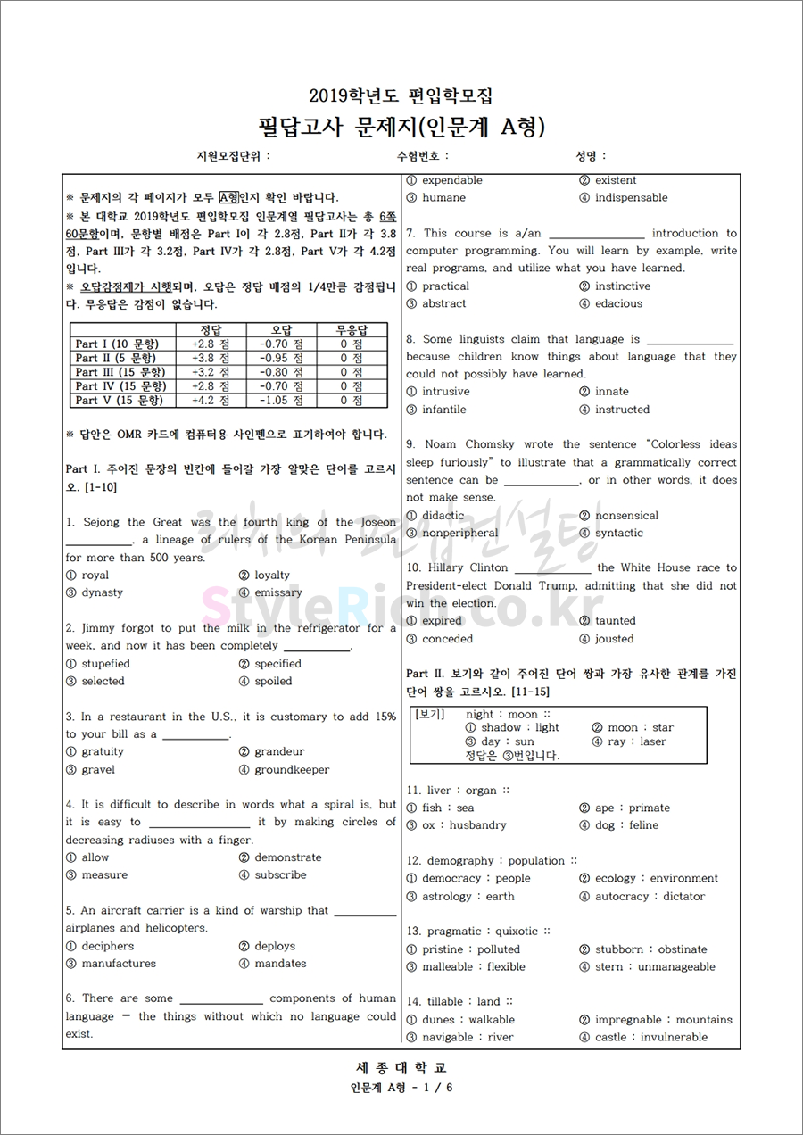 2019학년도 세종대 편입 영어 기출문제는 60문항 100분, 객관식 4지선다형, 총점 200점 만점에 배점은 Part 1이 2.8점, Part 2가 3.8점, Part 3가 3.2점, Part 4가 2.8점, Part 5가 4.2점입니다. 오답감점제을 시행하고 있어 틀린 답은 배점의 1/4만큼 감점되고 무응답은 감점이 없습니다.
