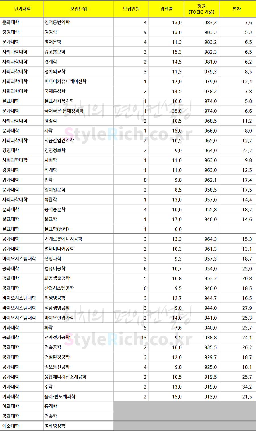 * 학과정렬은 토익점수가 높은 순으로 내림차순 정렬되었습니다.