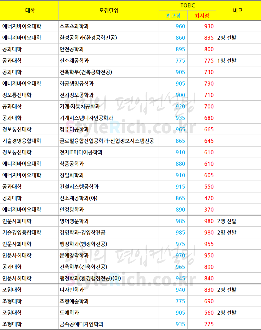 2019학년도 서울과학기술대 일반편입 최종등록자 토익 최고점, 최저점