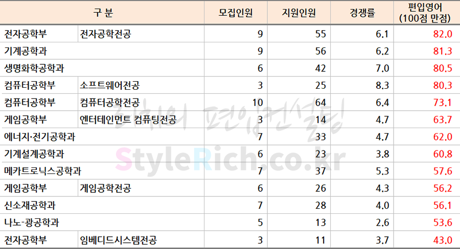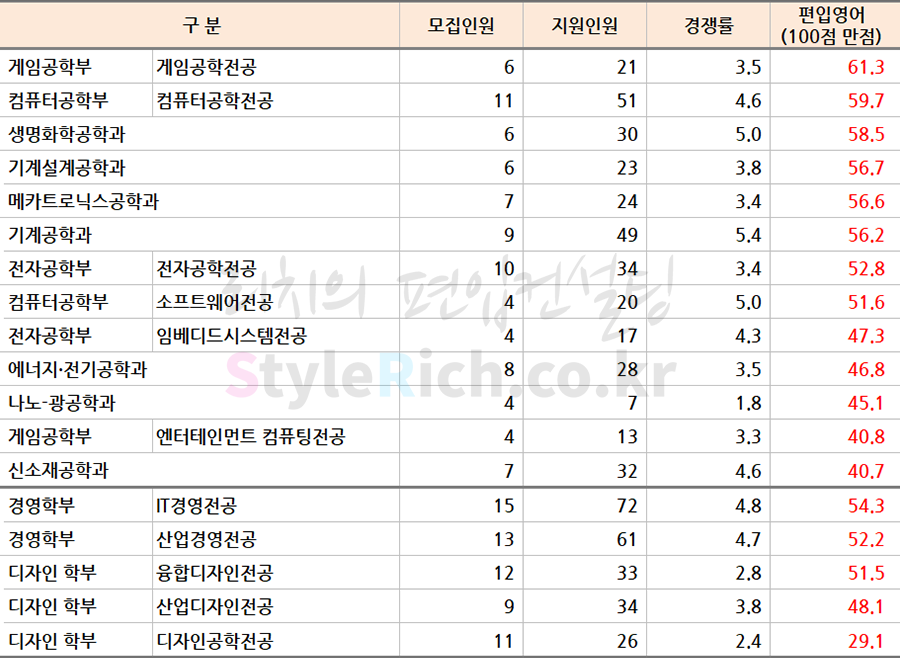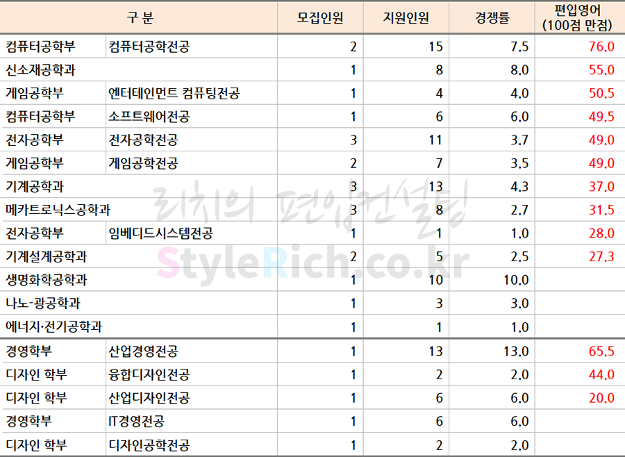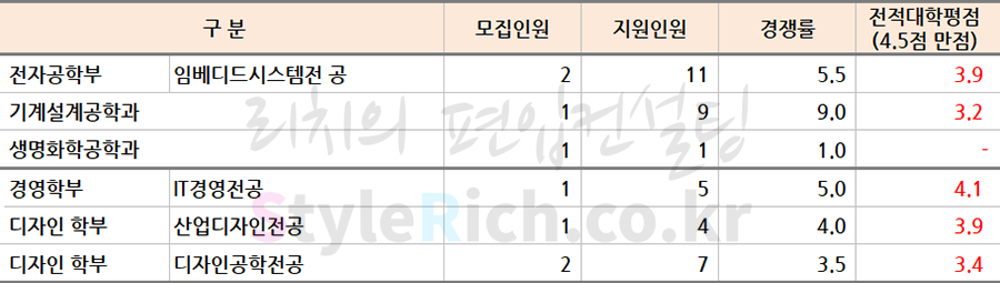 * 학과정렬은 자연계, 비자연계(경영학부, 디자인학부)로 분류 후 성적이 높은 순으로 정렬되어 있습니다.