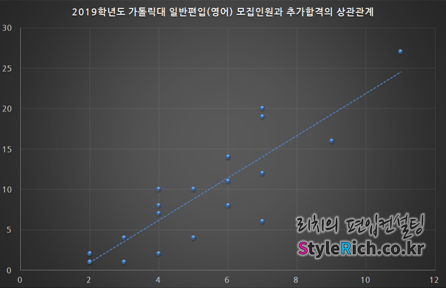 2019학년도 가톨릭대 일반편입 추가합격에서 주목할 점은 모집인원이 많을수록 추가합격이 많아지는 양의 상관관계를 가진다는 것이다. 하지만 학사편입이나 농어촌학생, 특성화고교졸업자편입에서는 모집단위별 모집인원의 차이가 크지 않고 모집단위도 적기 때문에 상관관계가 성립되지 않거나 검증을 하는 것조차도 어렵다.