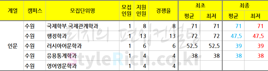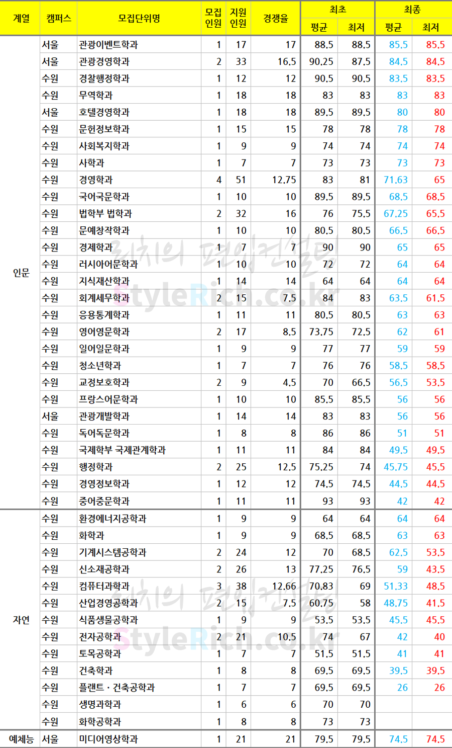 * 모집단위정렬은 인문, 자연, 예체능으로 분류 후 최종합격자 평균이 높은 순으로 정렬되어 있습니다.