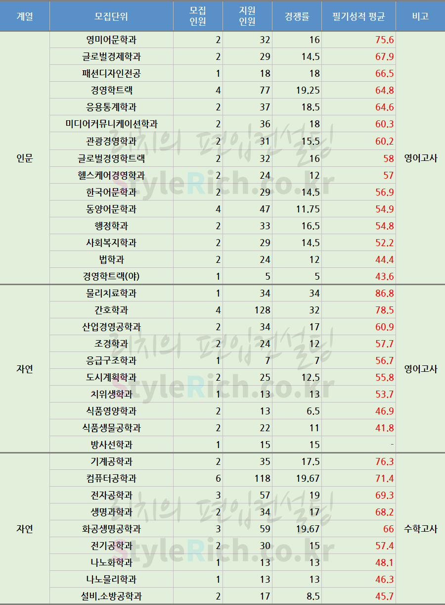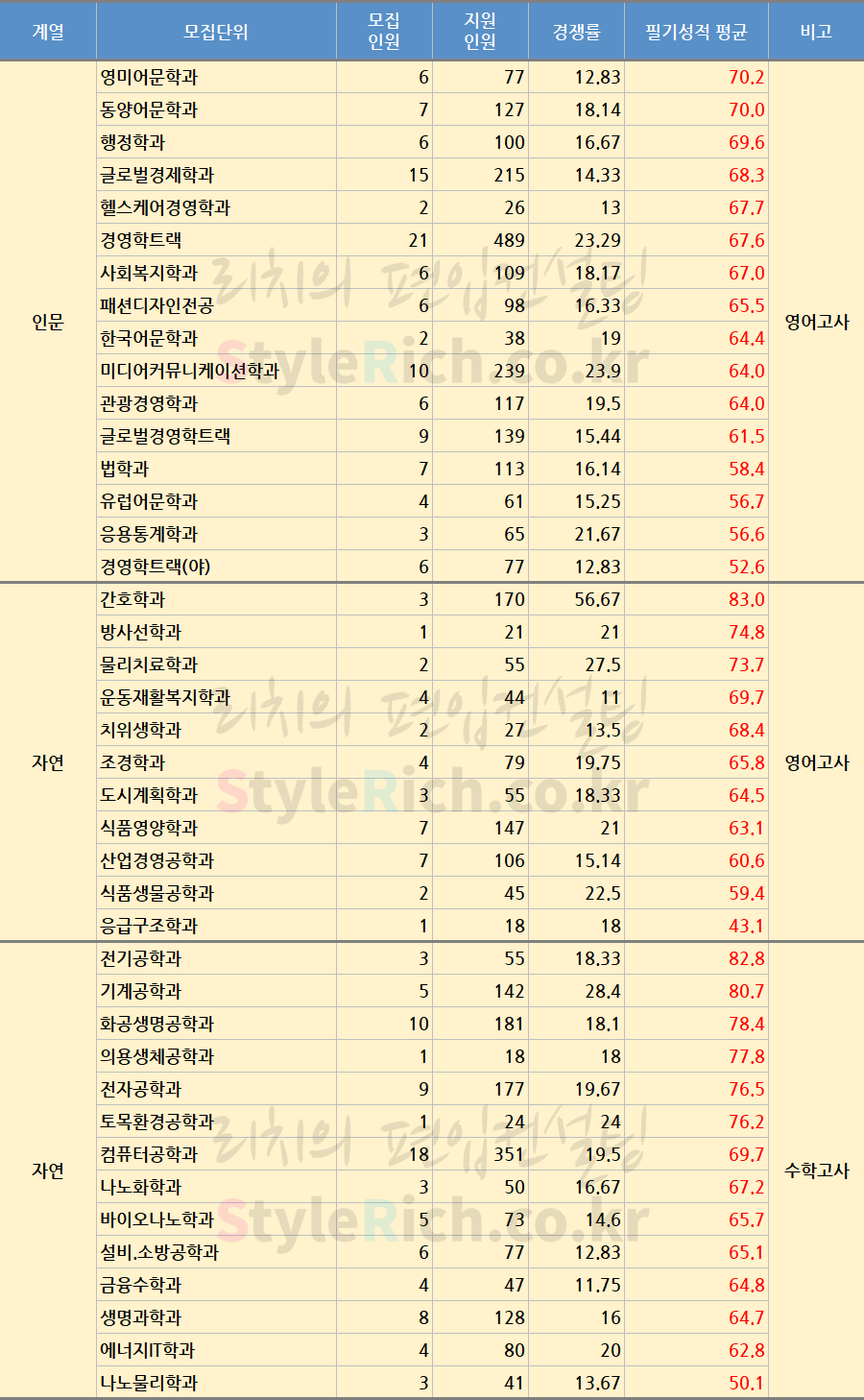 * 모집단위 정렬은 인문(영어), 자연(영어), 자연(수학)으로 분류 후 성적이 높은 순으로 정렬되어 있습니다.