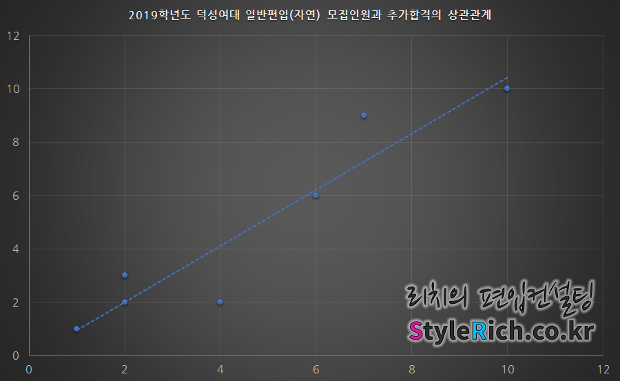 2019학년도 덕성여대 일반편입(자연)에서는 모집인원이 많을수록 추가합격이 많아지는 양의 상관관계가 성립되며, 예술대학에서도 양의 상관관계는 성립하고 있으나 표본이 적습니다. 학사편입, 농어촌학생, 특성화고교, 희망나눔편입에서는 모집단위의 인원이 모두 동일하여 상관관계가 성립되지 않습니다.