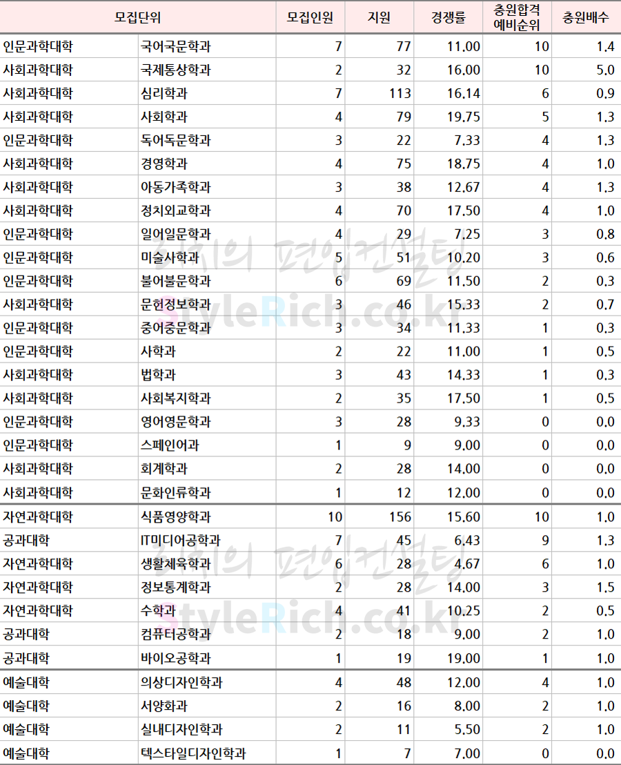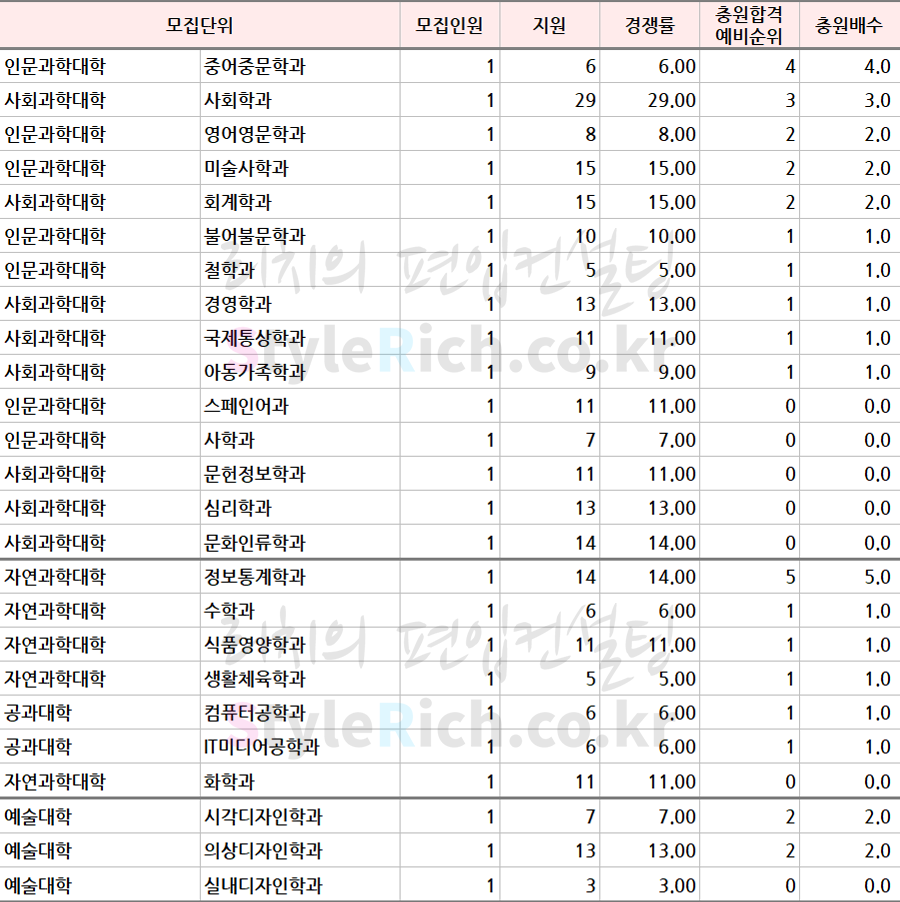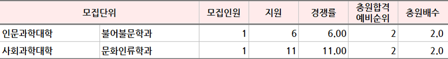 * 모집단위는 인문, 자연, 예능으로 분류 후 추가합격이 많은 순으로 정렬되어 있습니다.