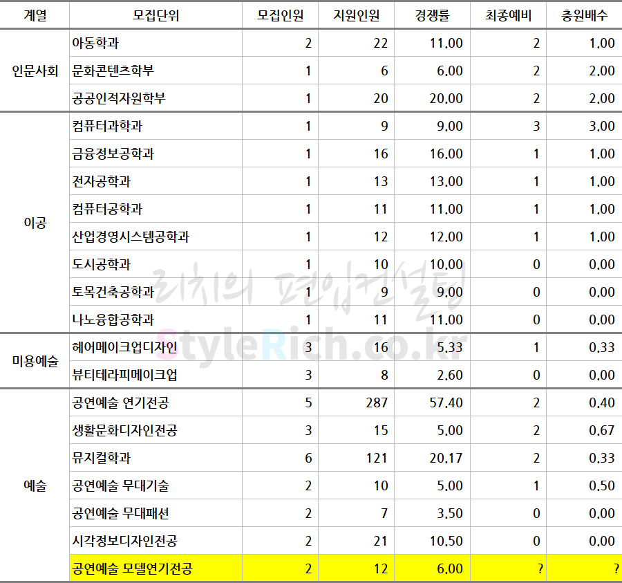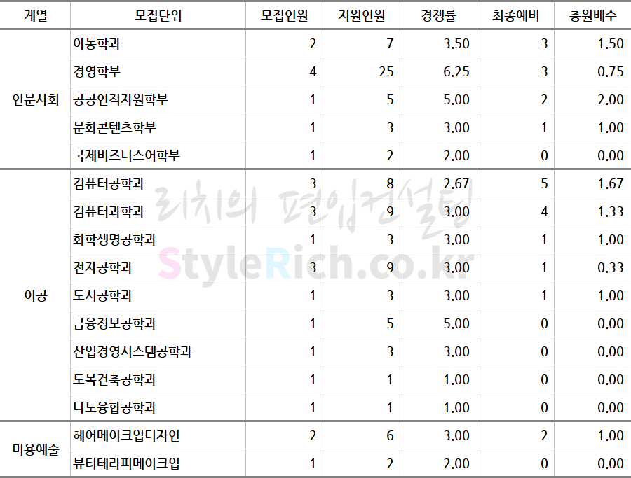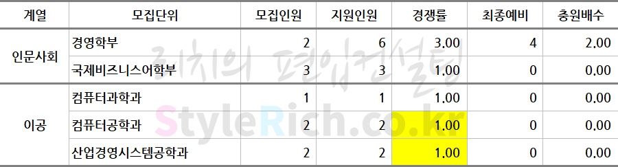 2019학년도 서경대 농어촌학생편입 추가합격 현황 컴퓨터공학과와 산업경영시스템공학과의 경우 추가합격 자료에서 공개한 경쟁률은 둘 다 2:1로 진학사의 최종 경쟁률과 달라 일단 진학사 기준으로 표기하였습니다. 물론 최종 경쟁률은 접수마감 이후 지원자격 등 확인작업 과정에서 변경될 수 있으나 해당 사유를 알 수 없기 때문에 시스템을 기반으로 표기된 진학사를 기준으로 임의 정정하였습니다.