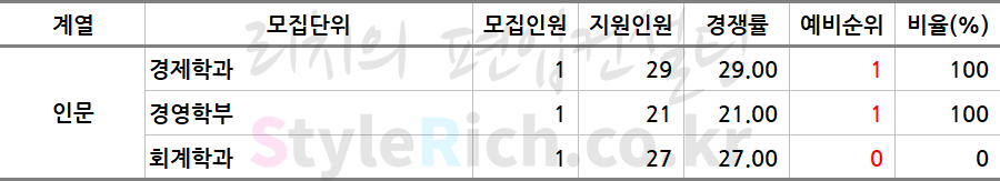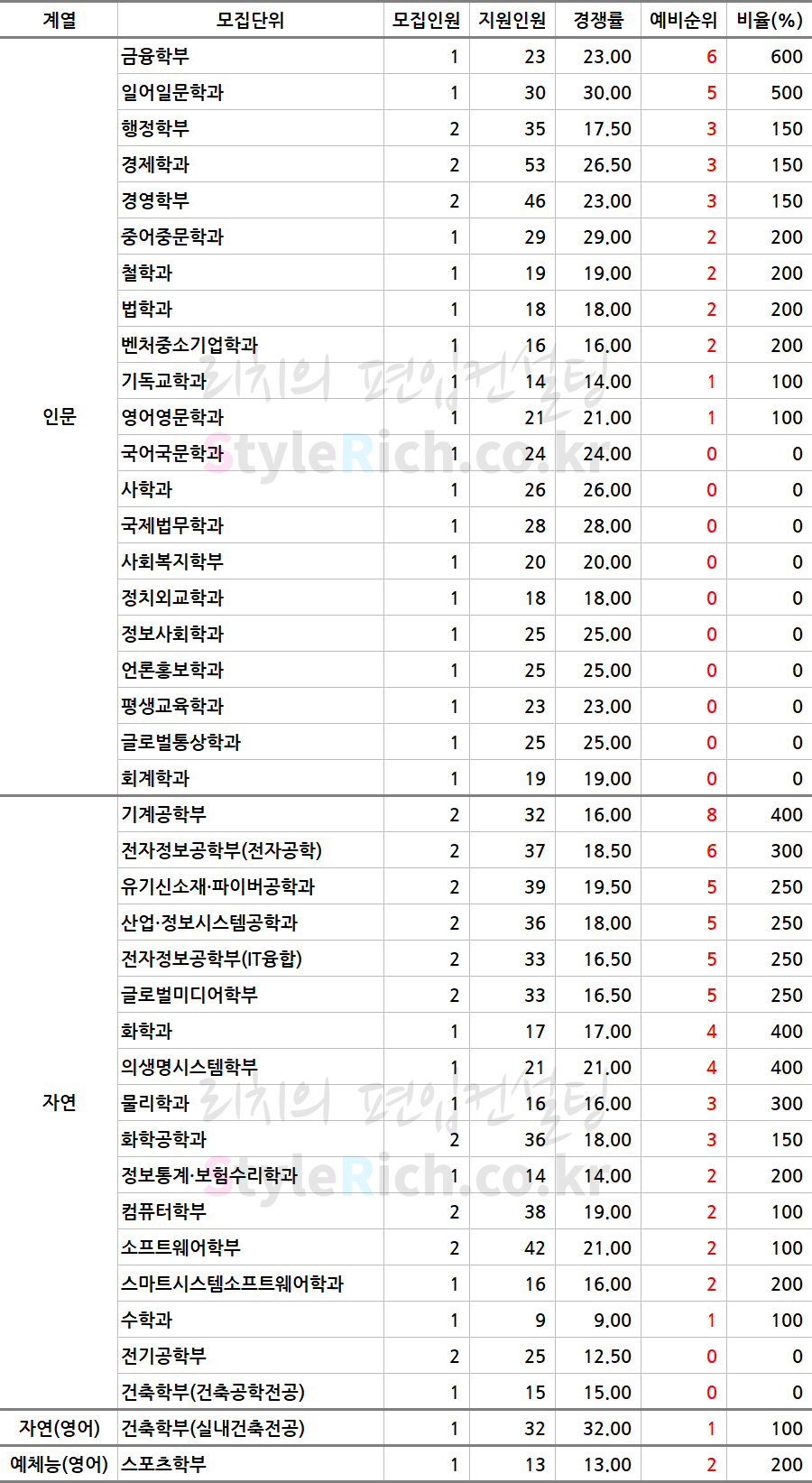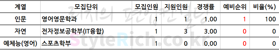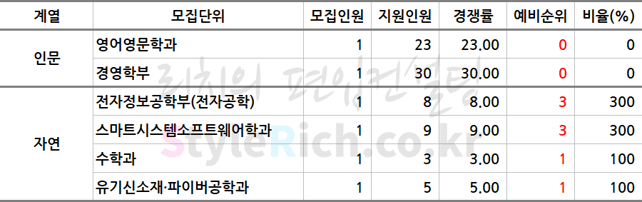 * 스포츠학부, 건축학부(실내건축전공)은 영어고사를 실시하여 각각 예체능(영어), 자연(영어)로 분류