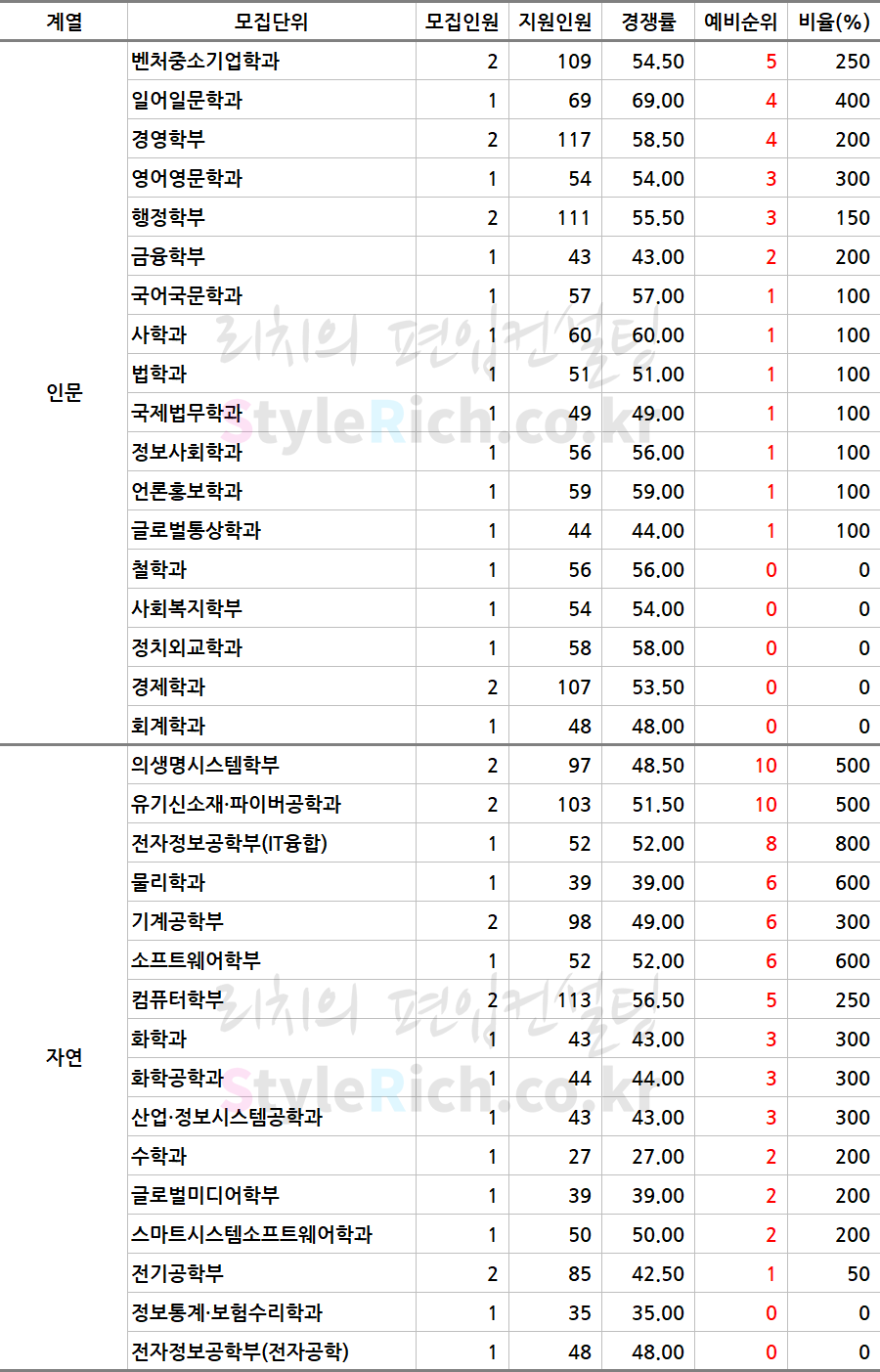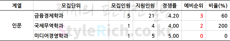 * 학과는 인문, 자연, 자연(영어), 예체능(영어)로 분류 후 추가합격에 많은 순으로 정렬