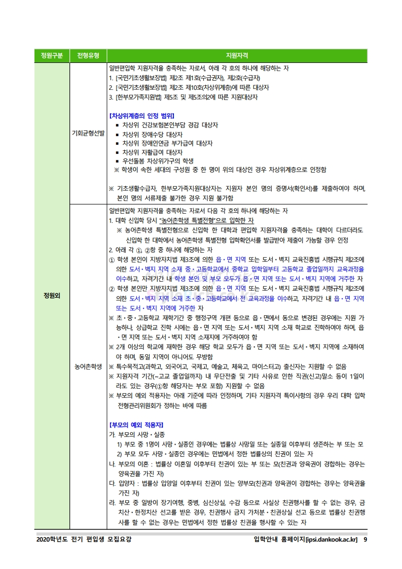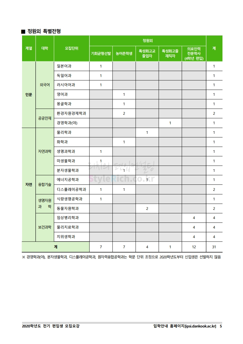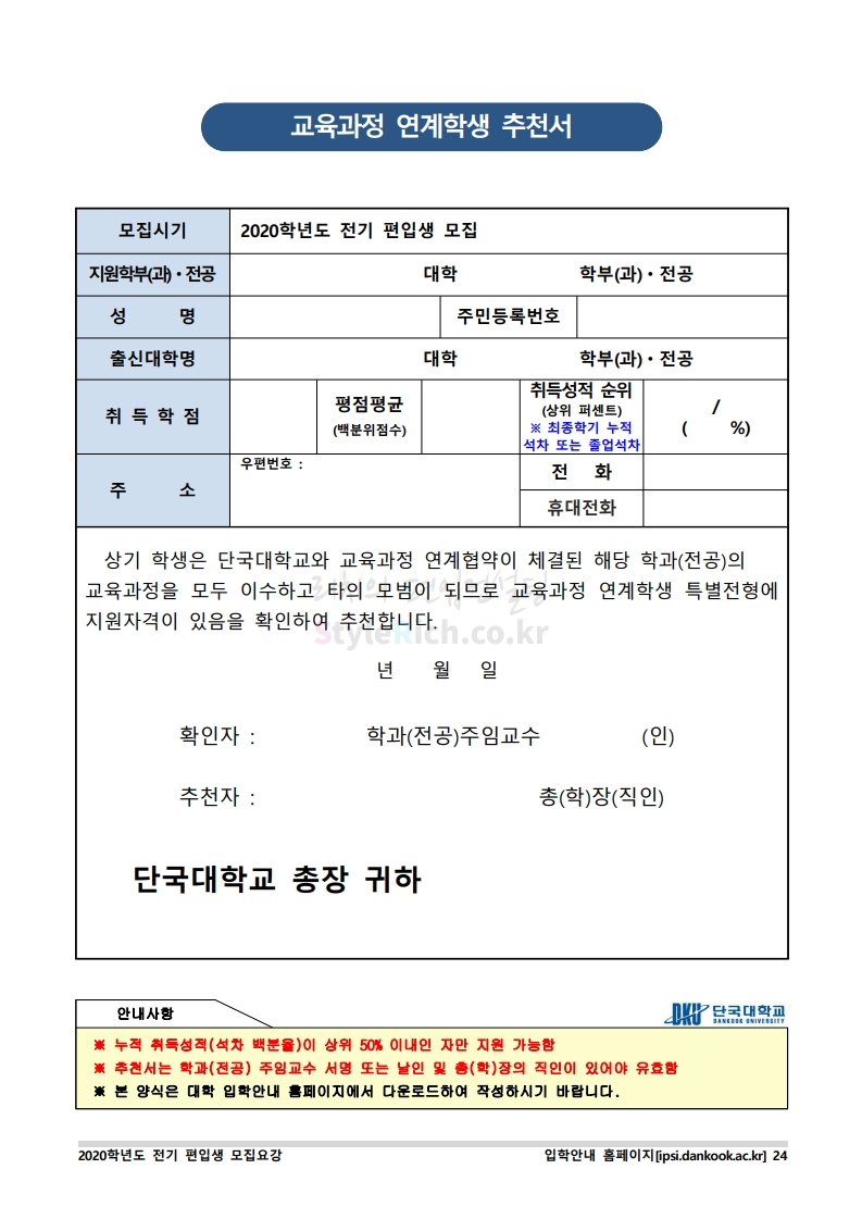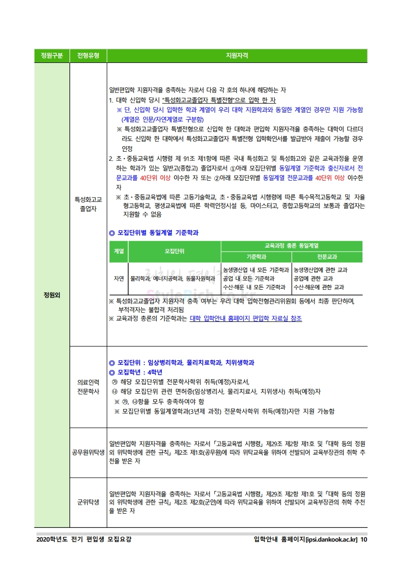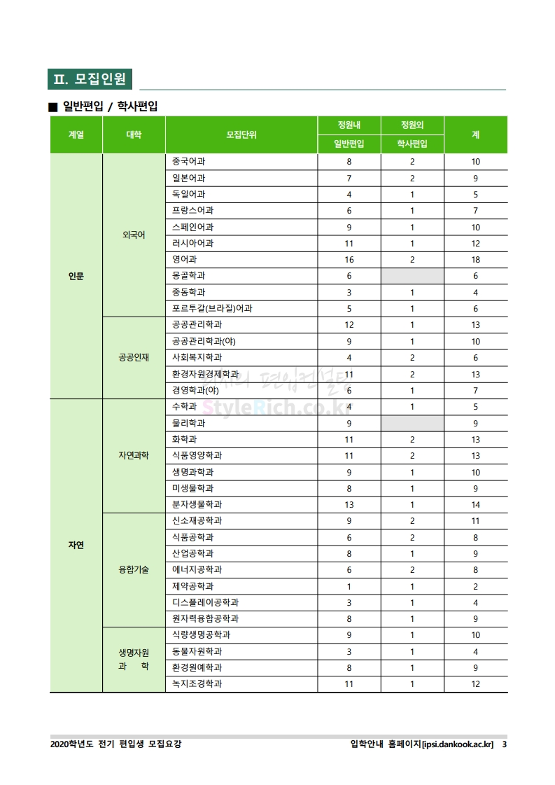 단국대(천안) 편입 2020학년도 모집요강 간편하게 보자 2019.12.01 12:57 편입 모집요강/2020학년도 모집요강 2020학년도 단국대(천안) 편입 모집요강 간편하게 확인하세요. PC와 모바일 모두에서 이미지를 클릭(터치) 후 이미지의 좌우측을 각각 클릭하면 모집요강 순서를 앞뒤로 넘길 수 있습니다. 좌측 클릭(터치)는 이전 페이지, 우측 클릭(터치)는 다음 페이지입니다. * 최종 모집요강 발표 후에도 일부 내용이 변경될 수 있으니 지원 전 반드시 단국대(천안) 입학처의 모집요강을 확인하시기 바랍니다. 2020학년도 단국대(천안) 편입 모집요강 다운받기 [천안캠퍼스] 2020학년도 편입생 모집요강.pdf 0.64MB <출처: 단국대(천안) 홈페이지> [천안]단무지, 단국대가 무지무지 궁금해! 공유하기 게시글 관리 리치의 편입컨설팅 저작자표시 비영리 변경금지 (새창열림) '편입 모집요강 > 2020학년도 모집요강' 카테고리의 다른 글 강남대 편입 2020학년도 모집요강 간편하게 보자 (0) 2019.12.05 경기대 편입 2020학년도 모집요강 간편하게 보자 (0) 2019.12.03 단국대(죽전) 편입 2020학년도 모집요강 간편하게 보자 (0) 2019.12.01 건국대 편입 2020학년도 모집요강 간편하게 보자 (0) 2019.12.01 고려대 (세종) 편입 2020학년도 모집요강 간편하게 보자 (0) 2019.12.01 댓글 공유하기 다른 글 댓글 이 글 공유하기 구독하기 구독하기 카카오톡 카카오톡 라인 라인 트위터 트위터 Facebook Facebook 카카오스토리 카카오스토리 밴드 밴드 네이버 블로그 네이버 블로그 Pocket Pocket Evernote Evernote 다른 글 강남대 편입 2020학년도 모집요강 간편하게 보자 강남대 편입 2020학년도 모집요강 간편하게 보자 2019.12.05 경기대 편입 2020학년도 모집요강 간편하게 보자 경기대 편입 2020학년도 모집요강 간편하게 보자 2019.12.03 단국대(죽전) 편입 2020학년도 모집요강 간편하게 보자 단국대(죽전) 편입 2020학년도 모집요강 간편하게 보자 2019.12.01 건국대 편입 2020학년도 모집요강 간편하게 보자 건국대 편입 2020학년도 모집요강 간편하게 보자 2019.12.01 다른 글 더 둘러보기