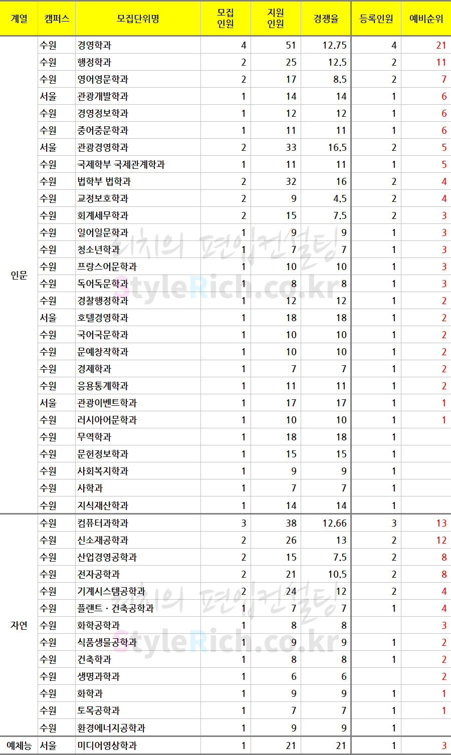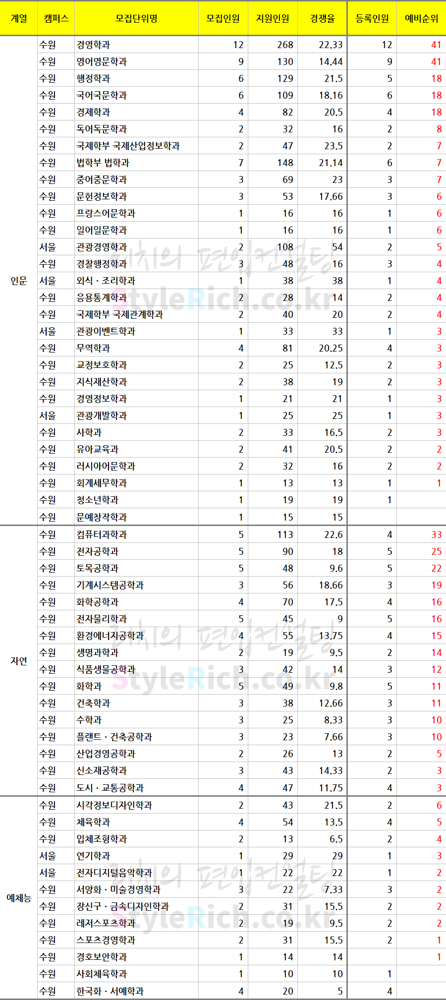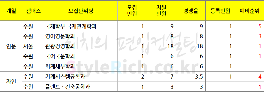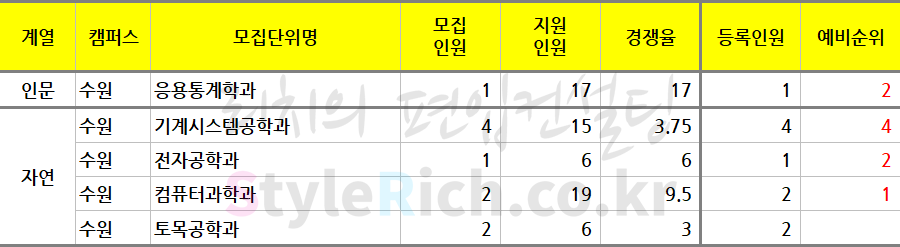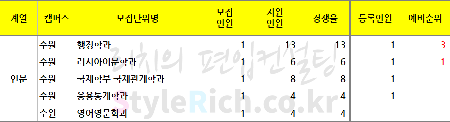 * 모집단위는 인문, 자연, 예체능으로 분류 후 추가합격이 많은 순으로 정렬