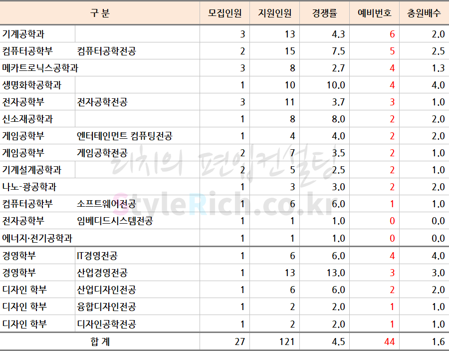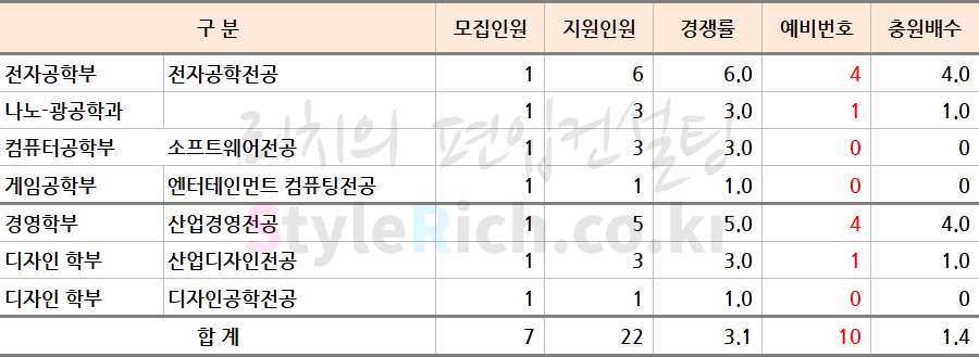 * 학과정렬은 자연계, 비자연계(경영학부, 디자인학부)로 분류 후 추가합격이 많은 순으로 정렬