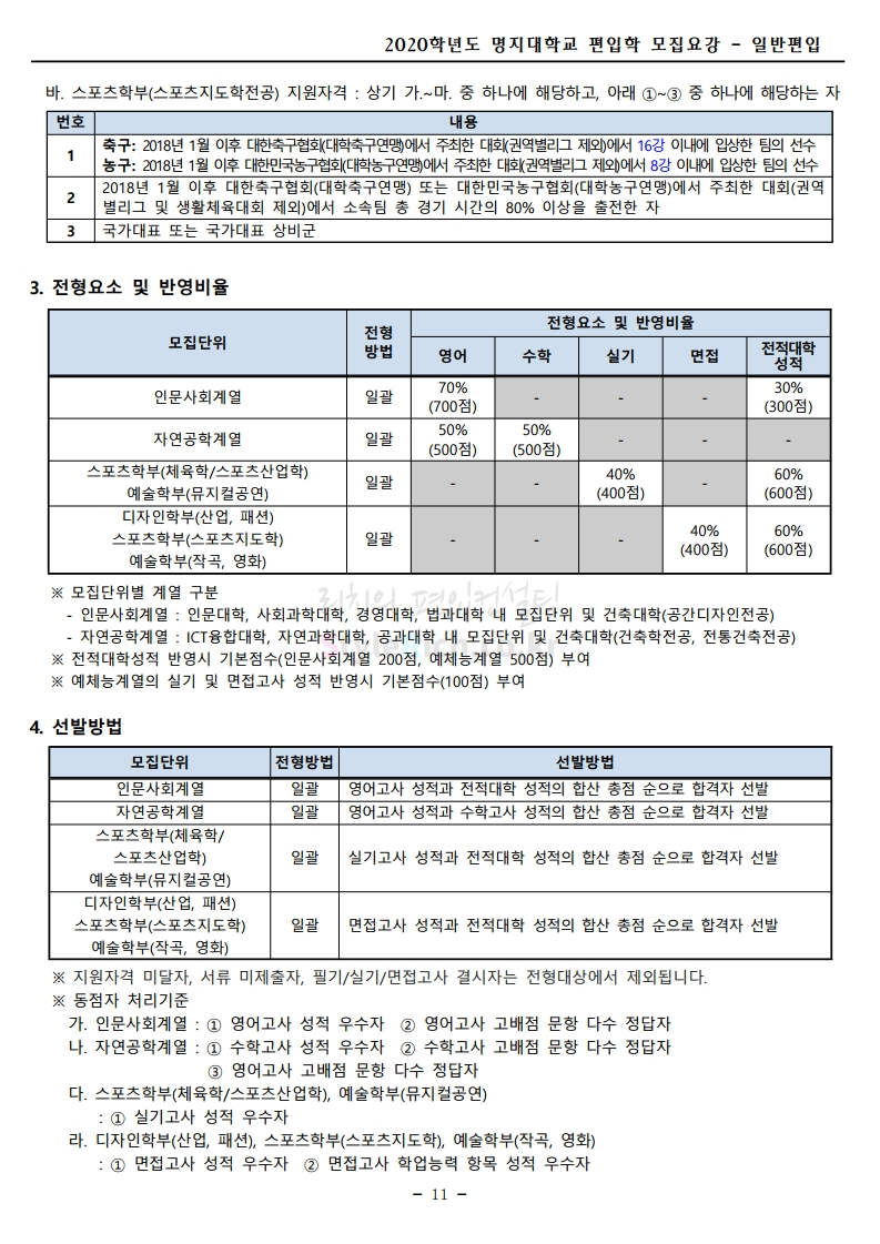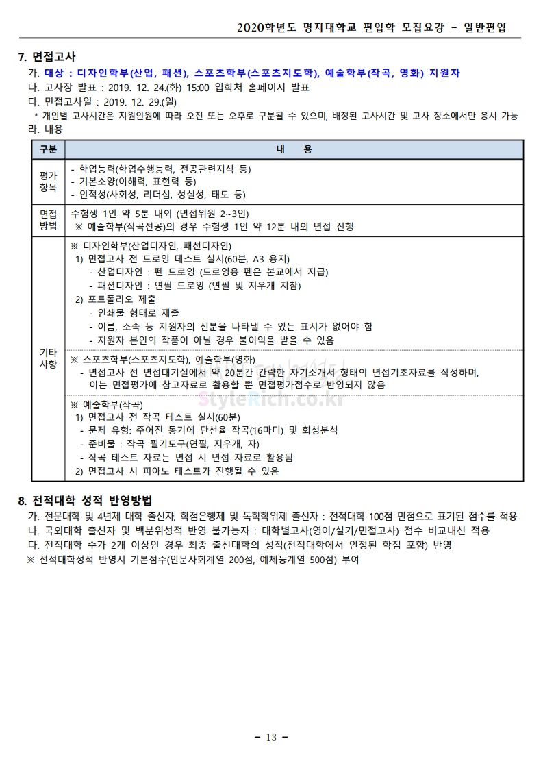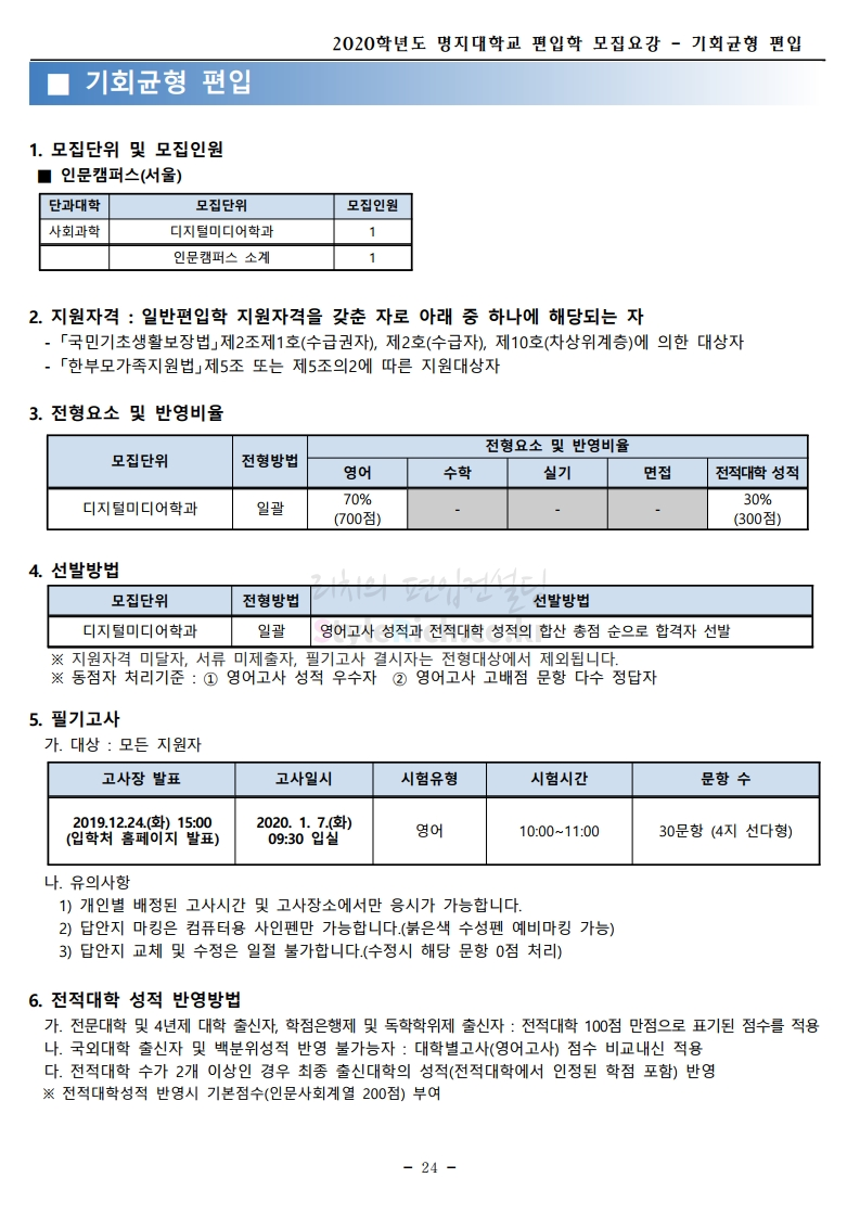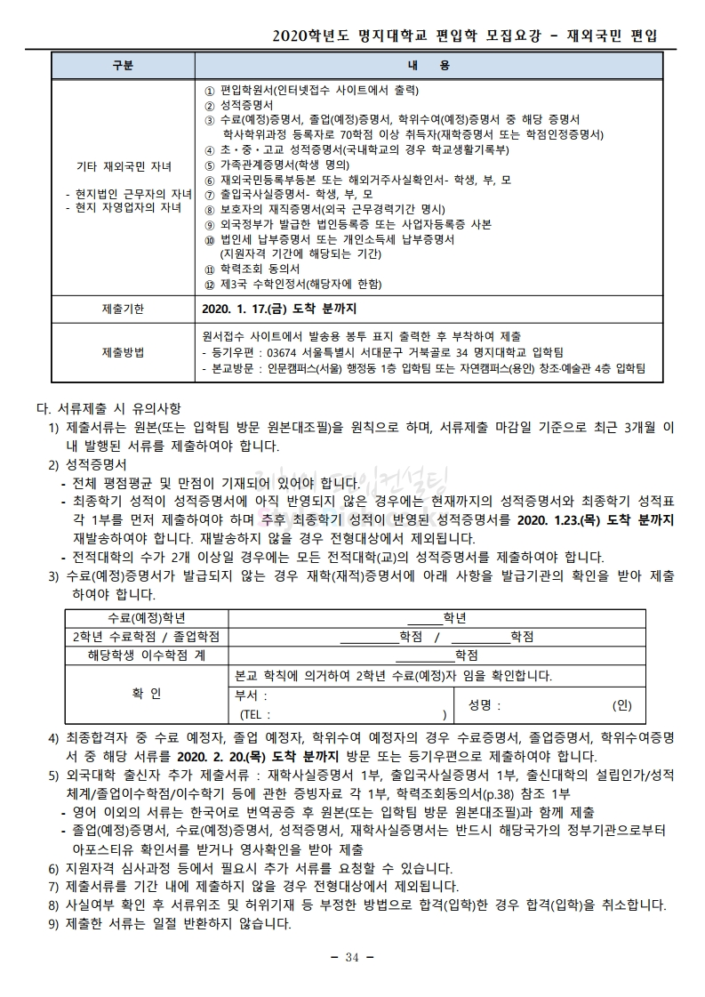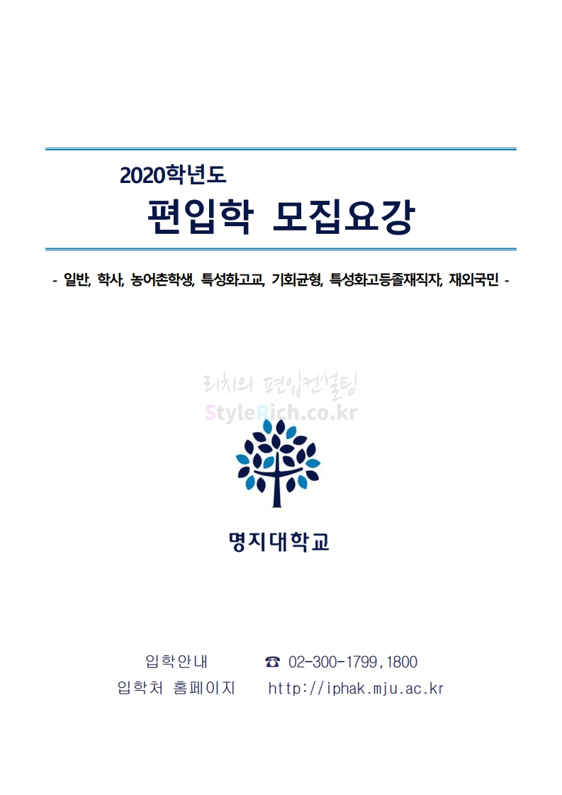 명지대 편입 2020학년도 모집요강 간편하게 보자 2019.12.05 02:53 편입 모집요강/2020학년도 모집요강 2020학년도 명지대 편입 모집요강 간편하게 확인하세요.PC와 모바일 모두에서 이미지를 클릭(터치) 후 이미지의 좌우측을 각각 클릭하면 모집요강 순서를 앞뒤로 넘길 수 있습니다. 좌측 클릭(터치)는 이전 페이지, 우측 클릭(터치)는 다음 페이지입니다. * 최종 모집요강 발표 후에도 일부 내용이 변경될 수 있으니 지원 전 반드시 명지대 입학처의 모집요강을 확인하시기 바랍니다. 2020학년도 명지대 편입 모집요강 다운받기 명지대학교_2020학년도_편입학_모집요강_홈페이지 공지.pdf 0.83MB <출처: 명지대 홈페이지> [명지투데이] 외국인 재학생과 함께하는 ‘세계음식축제’ 공유하기 게시글 관리 리치의 편입컨설팅 저작자표시 비영리 변경금지 (새창열림) '편입 모집요강 > 2020학년도 모집요강' 카테고리의 다른 글 숙명여대 편입 2020학년도 모집요강 간편하게 보자 (0) 2019.12.07 이화여대 편입 2020학년도 모집요강 간편하게 보자 (0) 2019.12.06 강남대 편입 2020학년도 모집요강 간편하게 보자 (0) 2019.12.05 경기대 편입 2020학년도 모집요강 간편하게 보자 (0) 2019.12.03 단국대(천안) 편입 2020학년도 모집요강 간편하게 보자 (0) 2019.12.01 댓글 공유하기 다른 글 댓글 이 글 공유하기 구독하기 구독하기 카카오톡 카카오톡 라인 라인 트위터 트위터 Facebook Facebook 카카오스토리 카카오스토리 밴드 밴드 네이버 블로그 네이버 블로그 Pocket Pocket Evernote Evernote 다른 글 숙명여대 편입 2020학년도 모집요강 간편하게 보자 숙명여대 편입 2020학년도 모집요강 간편하게 보자 2019.12.07 이화여대 편입 2020학년도 모집요강 간편하게 보자 이화여대 편입 2020학년도 모집요강 간편하게 보자 2019.12.06 강남대 편입 2020학년도 모집요강 간편하게 보자 강남대 편입 2020학년도 모집요강 간편하게 보자 2019.12.05 경기대 편입 2020학년도 모집요강 간편하게 보자 경기대 편입 2020학년도 모집요강 간편하게 보자 2019.12.03 다른 글 더 둘러보기