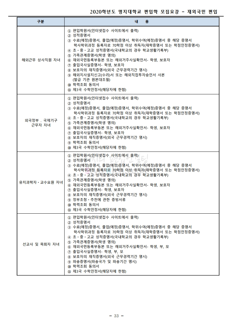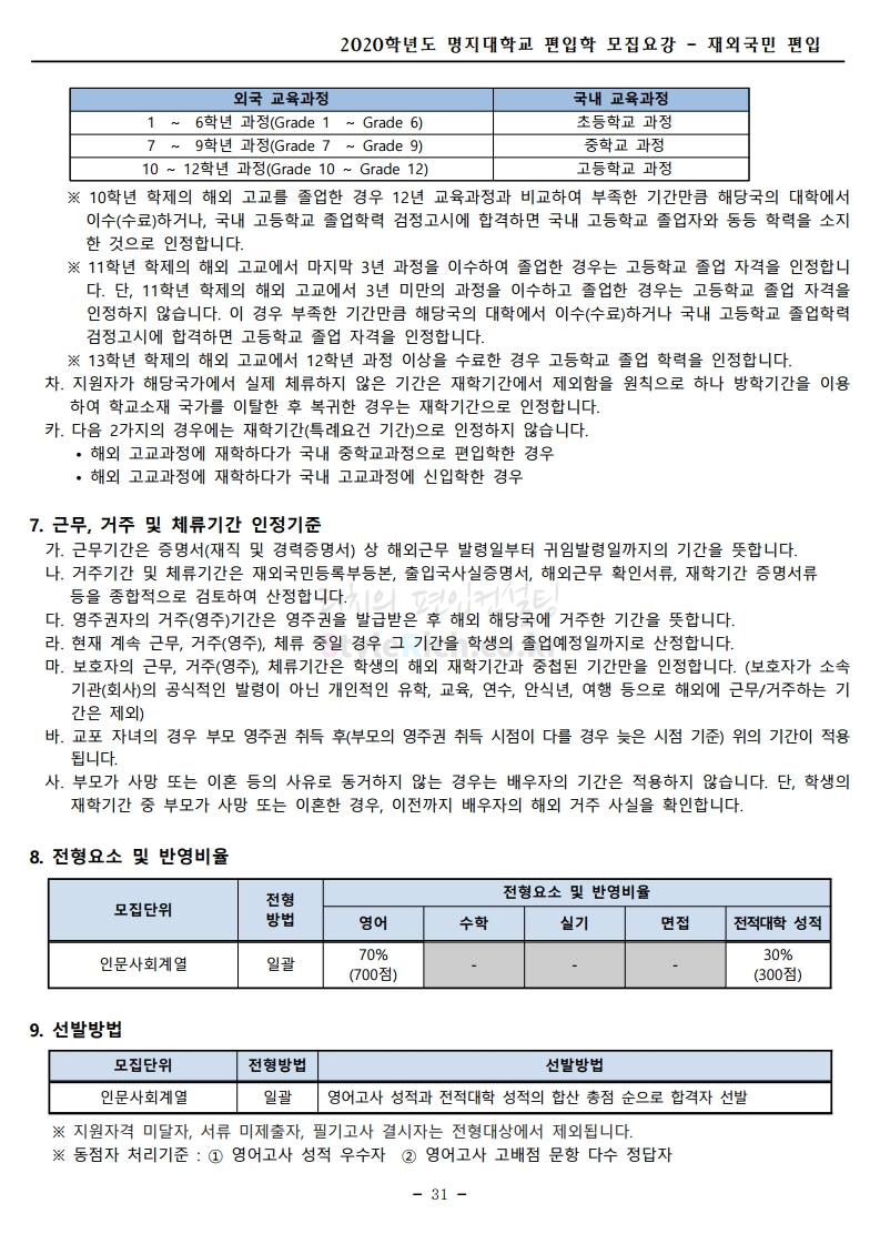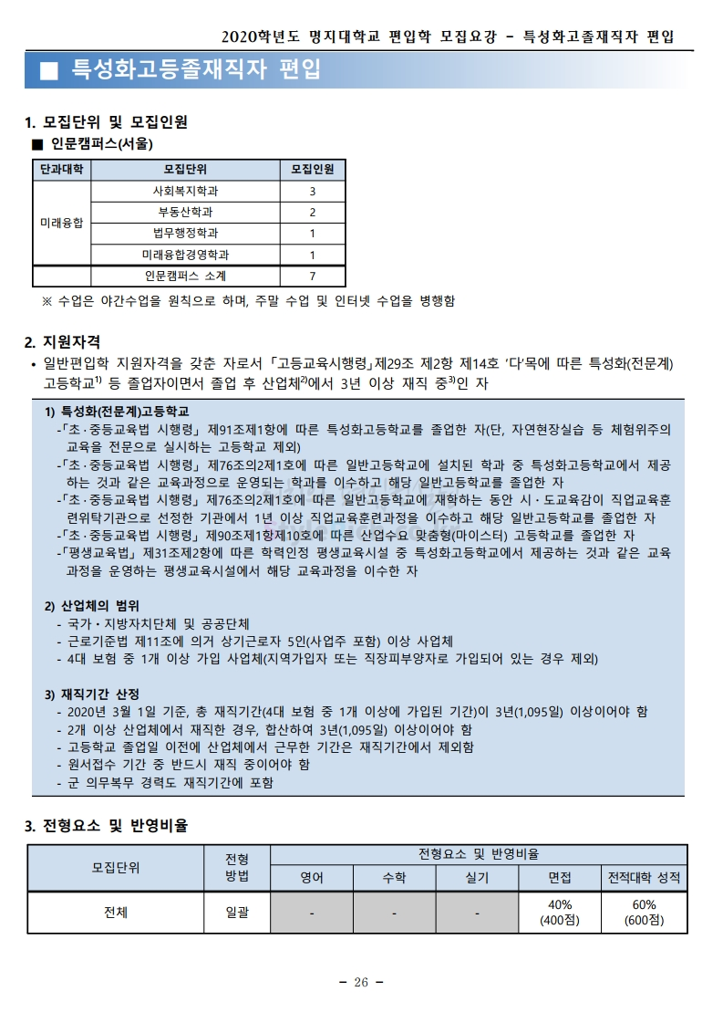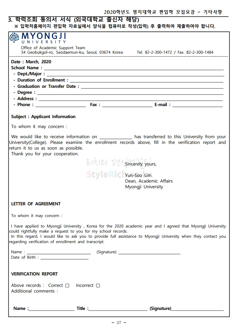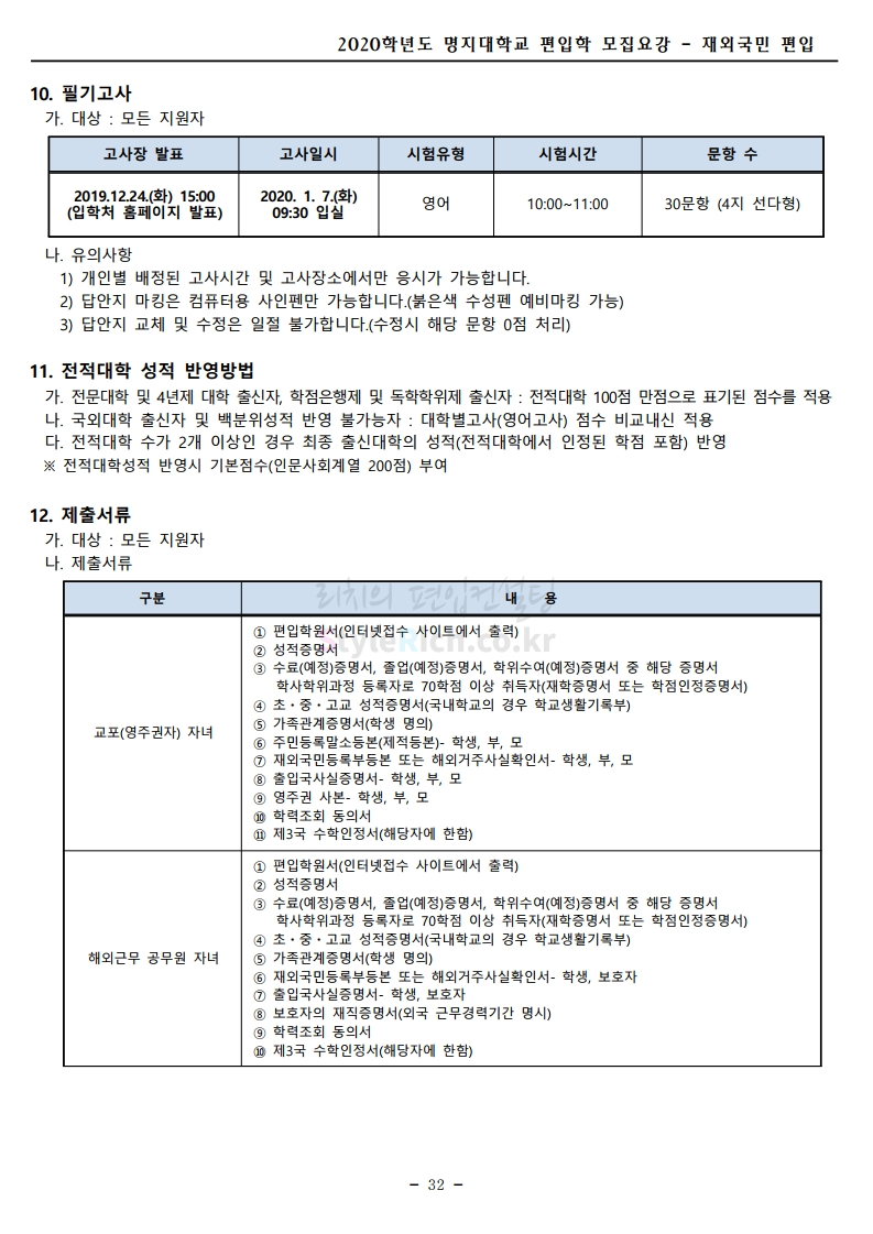 명지대 편입 2020학년도 모집요강 간편하게 보자 2019.12.05 02:53 편입 모집요강/2020학년도 모집요강 2020학년도 명지대 편입 모집요강 간편하게 확인하세요.PC와 모바일 모두에서 이미지를 클릭(터치) 후 이미지의 좌우측을 각각 클릭하면 모집요강 순서를 앞뒤로 넘길 수 있습니다. 좌측 클릭(터치)는 이전 페이지, 우측 클릭(터치)는 다음 페이지입니다. * 최종 모집요강 발표 후에도 일부 내용이 변경될 수 있으니 지원 전 반드시 명지대 입학처의 모집요강을 확인하시기 바랍니다. 2020학년도 명지대 편입 모집요강 다운받기 명지대학교_2020학년도_편입학_모집요강_홈페이지 공지.pdf 0.83MB <출처: 명지대 홈페이지> [명지투데이] 외국인 재학생과 함께하는 ‘세계음식축제’ 공유하기 게시글 관리 리치의 편입컨설팅 저작자표시 비영리 변경금지 (새창열림) '편입 모집요강 > 2020학년도 모집요강' 카테고리의 다른 글 숙명여대 편입 2020학년도 모집요강 간편하게 보자 (0) 2019.12.07 이화여대 편입 2020학년도 모집요강 간편하게 보자 (0) 2019.12.06 강남대 편입 2020학년도 모집요강 간편하게 보자 (0) 2019.12.05 경기대 편입 2020학년도 모집요강 간편하게 보자 (0) 2019.12.03 단국대(천안) 편입 2020학년도 모집요강 간편하게 보자 (0) 2019.12.01 댓글 공유하기 다른 글 댓글 이 글 공유하기 구독하기 구독하기 카카오톡 카카오톡 라인 라인 트위터 트위터 Facebook Facebook 카카오스토리 카카오스토리 밴드 밴드 네이버 블로그 네이버 블로그 Pocket Pocket Evernote Evernote 다른 글 숙명여대 편입 2020학년도 모집요강 간편하게 보자 숙명여대 편입 2020학년도 모집요강 간편하게 보자 2019.12.07 이화여대 편입 2020학년도 모집요강 간편하게 보자 이화여대 편입 2020학년도 모집요강 간편하게 보자 2019.12.06 강남대 편입 2020학년도 모집요강 간편하게 보자 강남대 편입 2020학년도 모집요강 간편하게 보자 2019.12.05 경기대 편입 2020학년도 모집요강 간편하게 보자 경기대 편입 2020학년도 모집요강 간편하게 보자 2019.12.03 다른 글 더 둘러보기